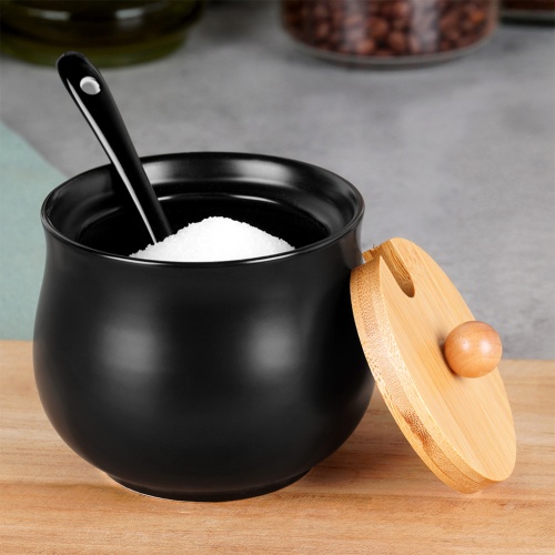 Efektowna cukierniczka ze zdejmowaną pokrywką i łyżeczką w zestawie. Wykonana z ceramiki w czarnym kolorze, a pokrywa z drewna bambusowego.