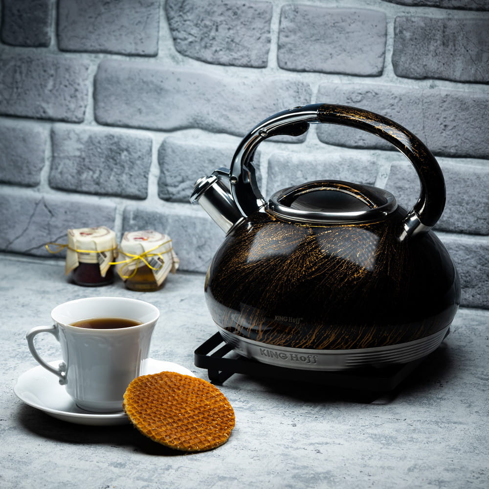 Czajnik z gwizdkiem 3.0L KINGHOFF z linii GOLD wykonany z wysokiej jakości stali nierdzewnej 18/10 pokrytej lakierem akrylowym. Można go stosować na wszystkich rodzajach kuchenek, także na kuchenkach indukcyjnych. Eleganckie wzornictwo, pasujące do każdej kuchni.