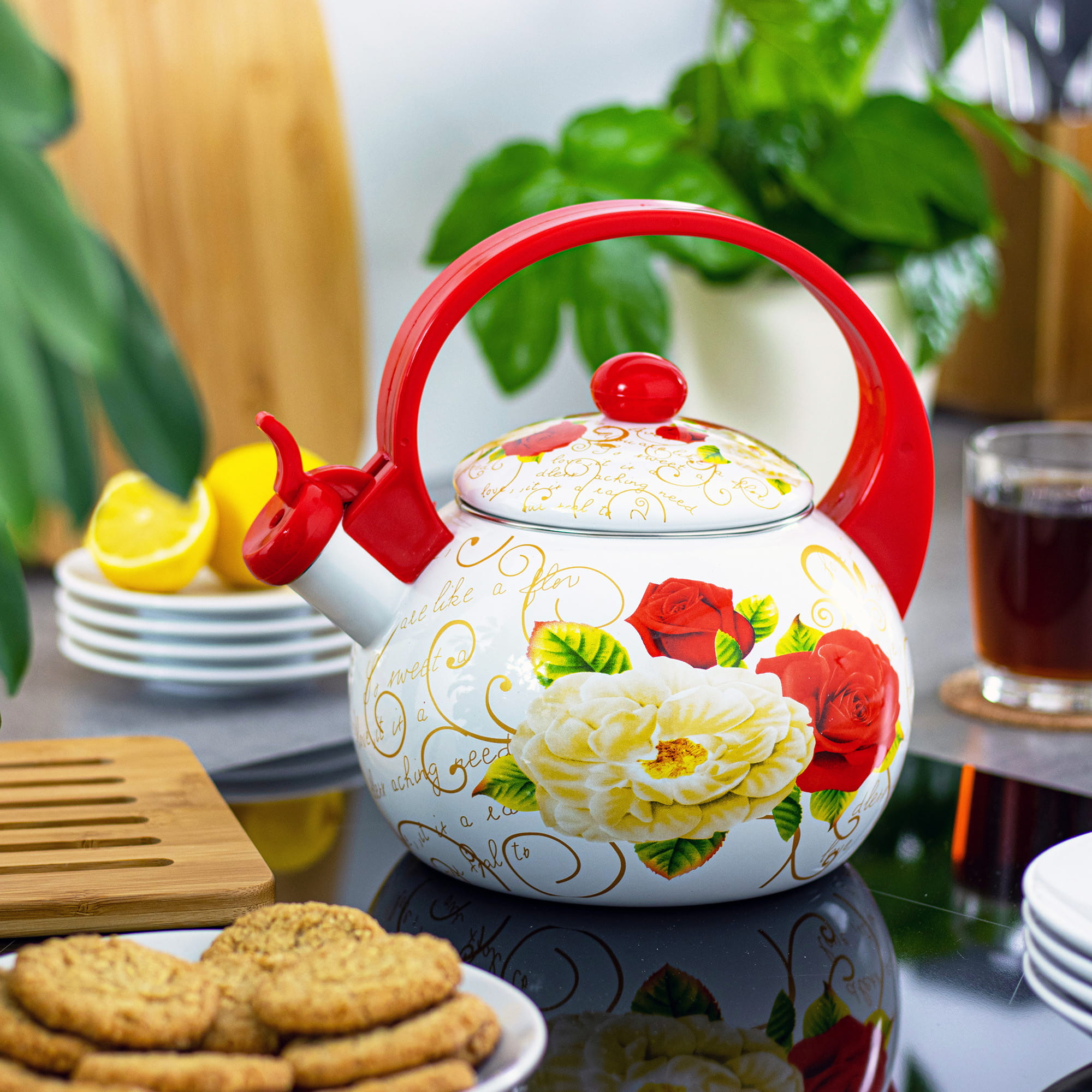 Czajnik emaliowany 2L marki KINGHOFF wzór białe i czerwone róże – elegancja i funkcjonalność w Twojej kuchni