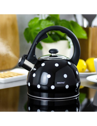 Czajnik 2.0L z gwizdkiem KINGHOFF wykonany z wysokiej jakości stali nierdzewnej pokrytej emalią. Można go stosować na wszystkich rodzajach kuchenek, także na kuchenkach indukcyjnych. Gwizdek zintegrowany w rączce. Pokrywka z polerowanej stali nierdzewnej. Ciekawy wzór w groszki.