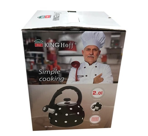 Czajnik 2.0L z gwizdkiem KINGHOFF wykonany z wysokiej jakości stali nierdzewnej pokrytej emalią. Można go stosować na wszystkich rodzajach kuchenek, także na kuchenkach indukcyjnych. Gwizdek zintegrowany w rączce. Pokrywka z polerowanej stali nierdzewnej. Ciekawy wzór w groszki.