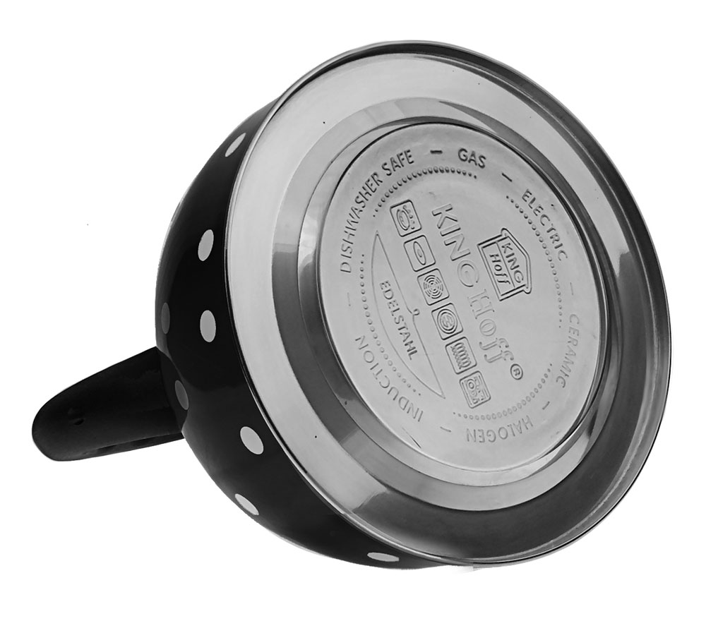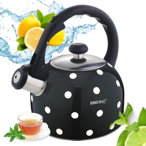 Czajnik 2.6L z gwizdkiem KINGHOFF wykonany z wysokiej jakości stali nierdzewnej pokrytej emalią. Można go stosować na wszystkich rodzajach kuchenek, także na kuchenkach indukcyjnych. Gwizdek zintegrowany w rączce. Pokrywka z polerowanej stali nierdzewnej. Ciekawy wzór w groszki.