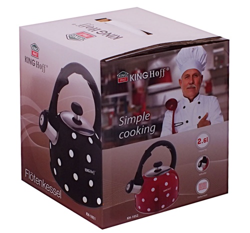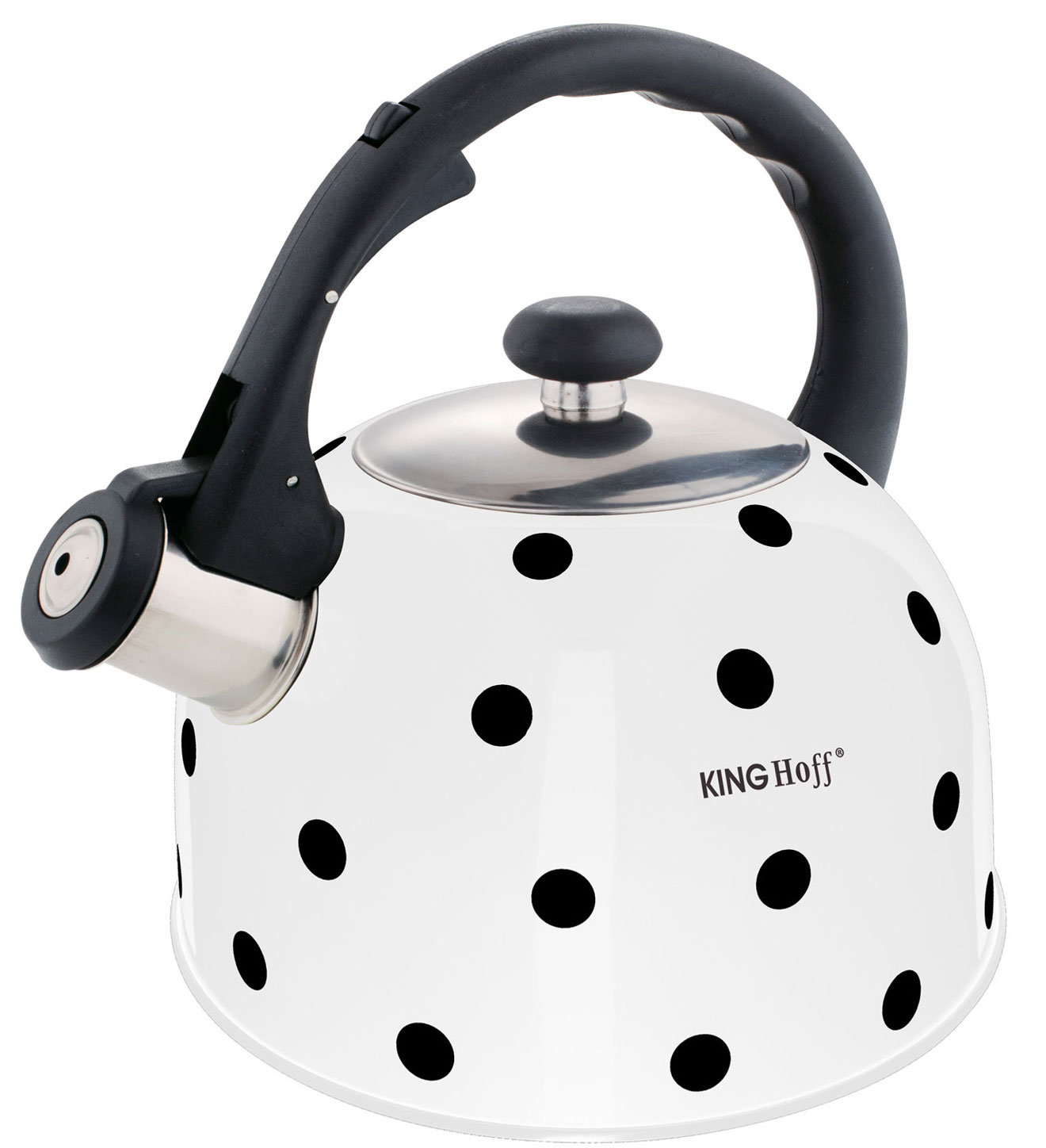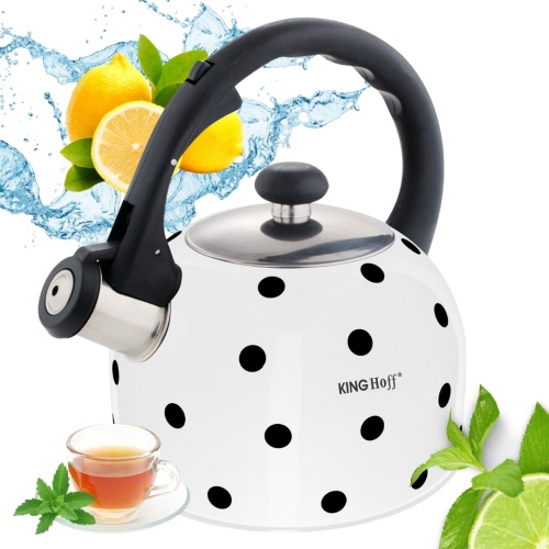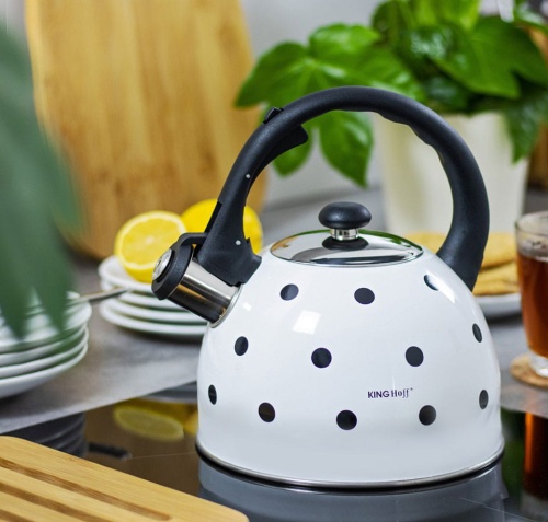 Czajnik 2.6L z gwizdkiem KINGHOFF wykonany z wysokiej jakości stali nierdzewnej pokrytej emalią. Można go stosować na wszystkich rodzajach kuchenek, także na kuchenkach indukcyjnych. Gwizdek zintegrowany w rączce. Pokrywka z polerowanej stali nierdzewnej. Ciekawy wzór w groszki. Kolor BIAŁY.