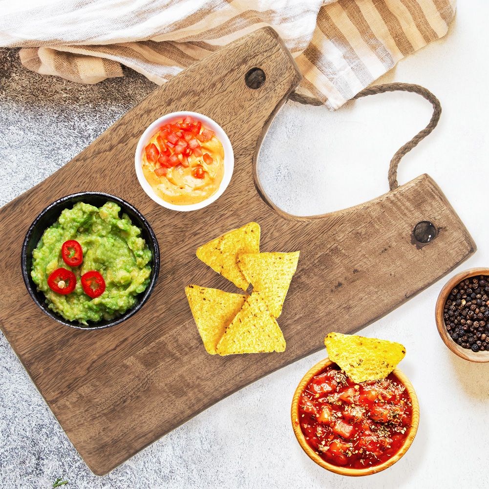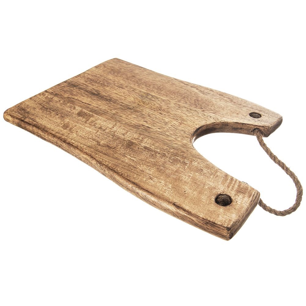 Deska kuchenna wykonana z drewna mangowca ze sznurkiem jutowym. Posiada piękny, nieregularny kształt. Sprawdzi się do krojenia oraz serwowania przystawek i dań ciepłych oraz zimnych.
