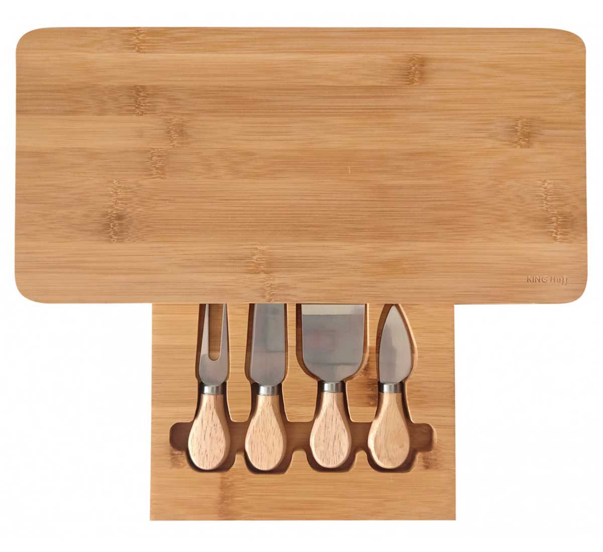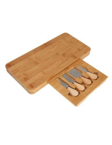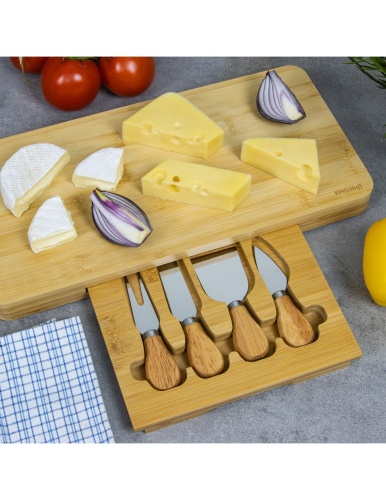 Deska bambusowa w zestawie z akcesoriami do sera - 5 elementów. Dzięki praktycznej szufladce przybory możemy schować wewnątrz deski.