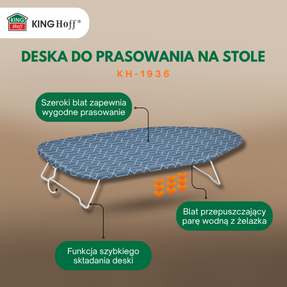 KINGHOFF KH-1936 to kompaktowa i praktyczna deska do prasowania na stół , zaprojektowana z myślą o wygodzie,...–...