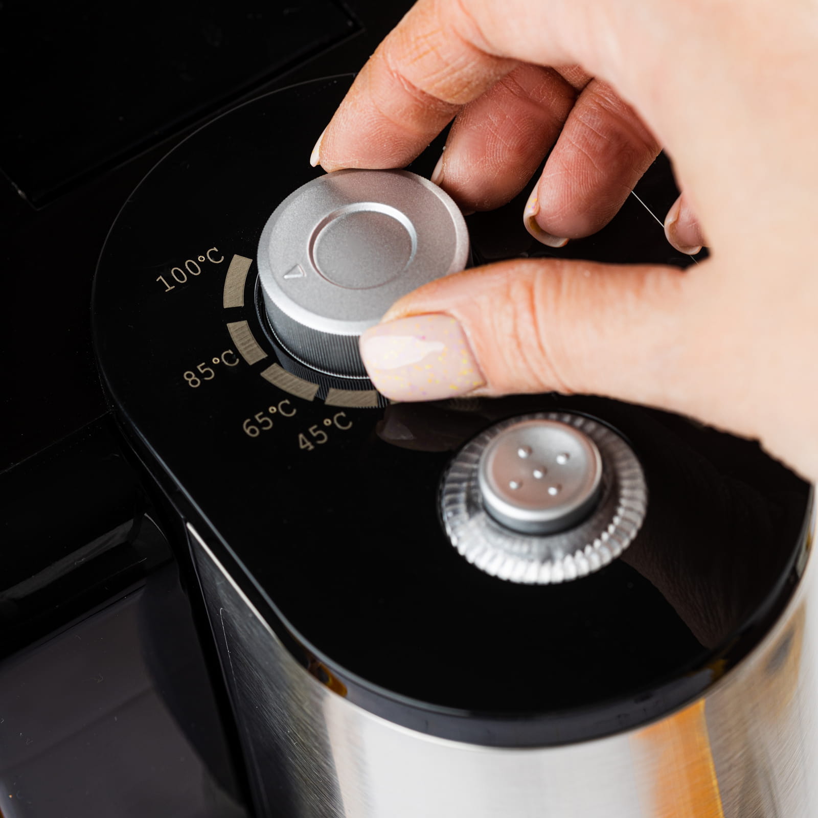- Funkcja regulowania temperatury - wyposażony w pokrętło do regulacji zmiennej temperatury wody od normalnej temperatury wody do 100 °C (45 °C, 65 °C, 85 °C, 100 °C).