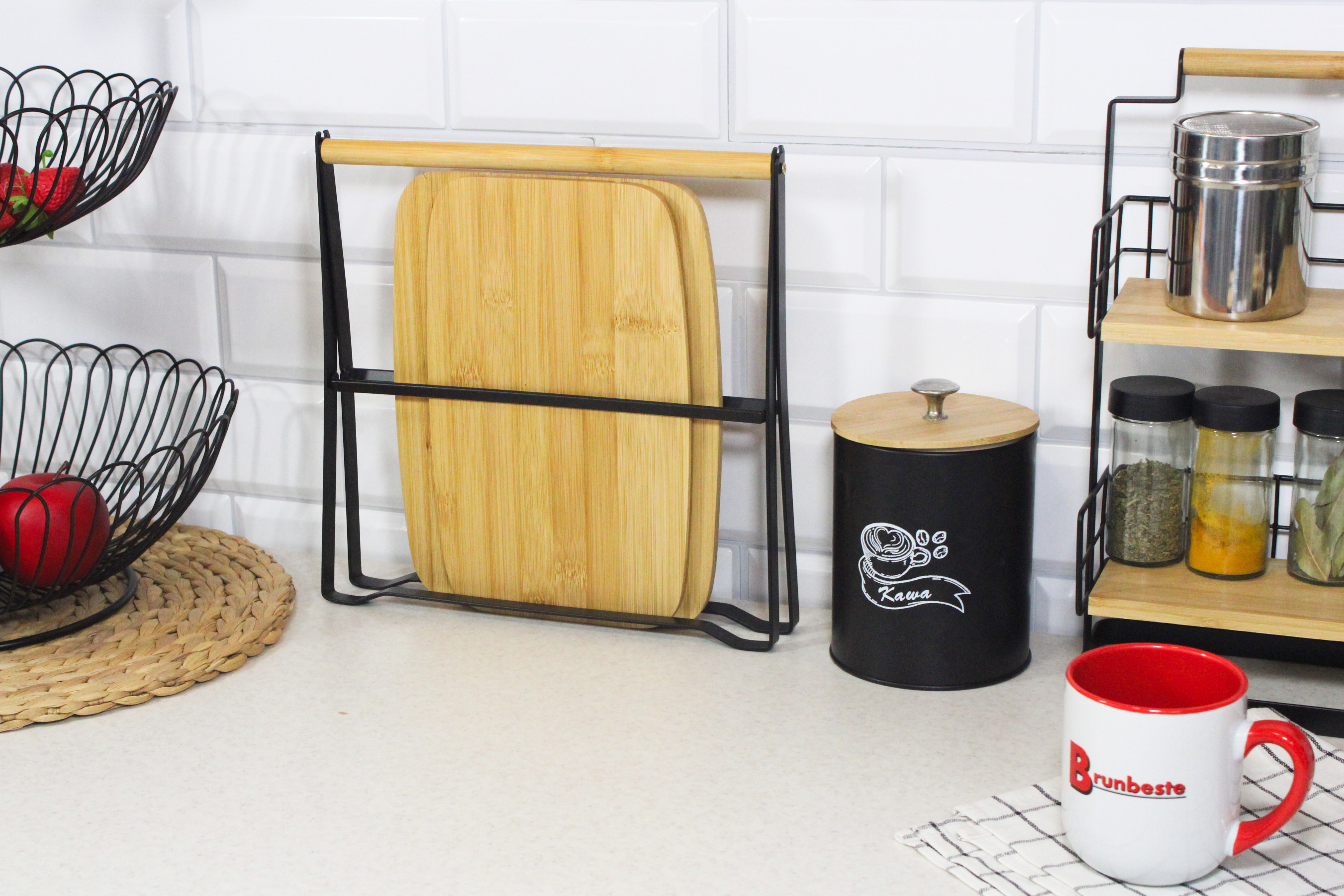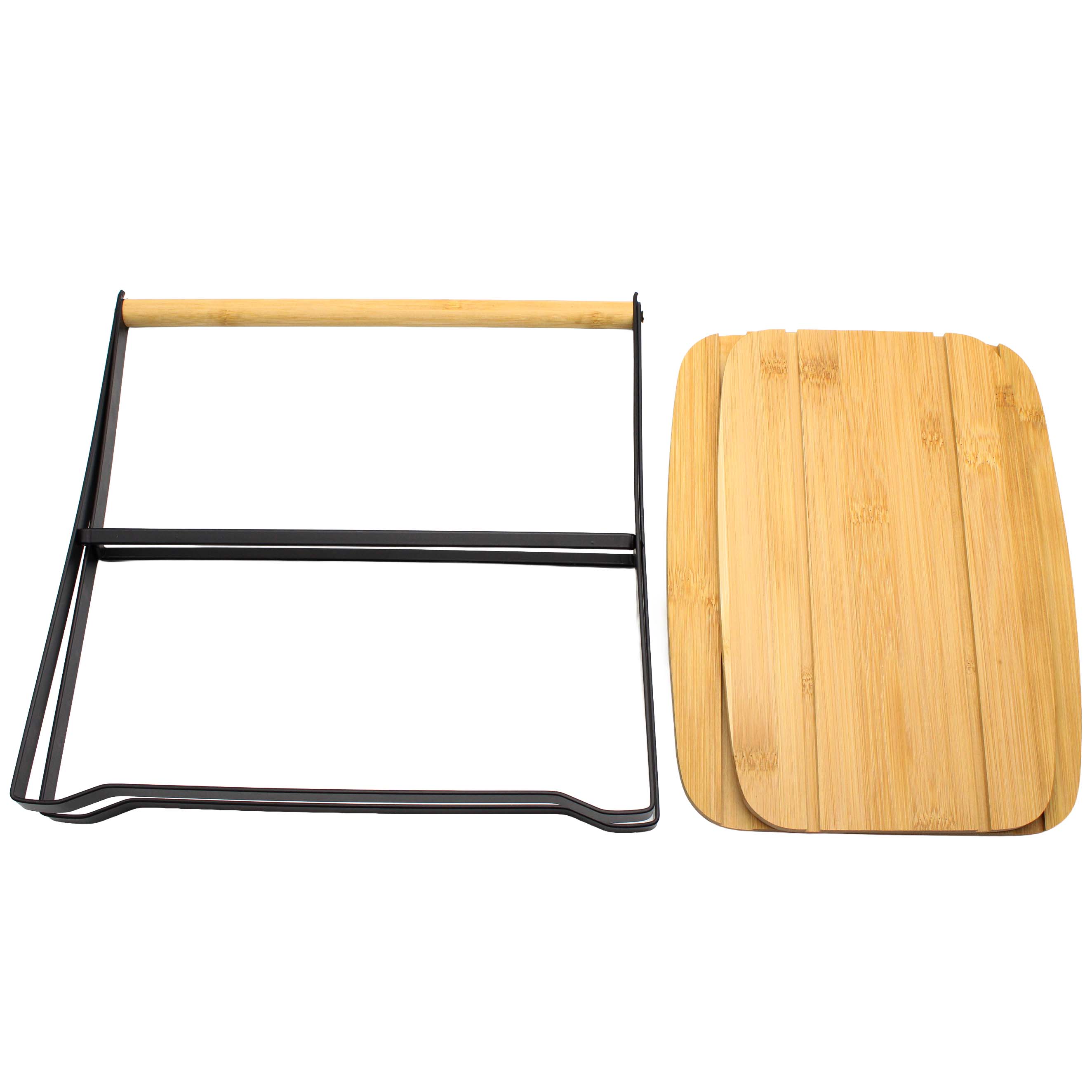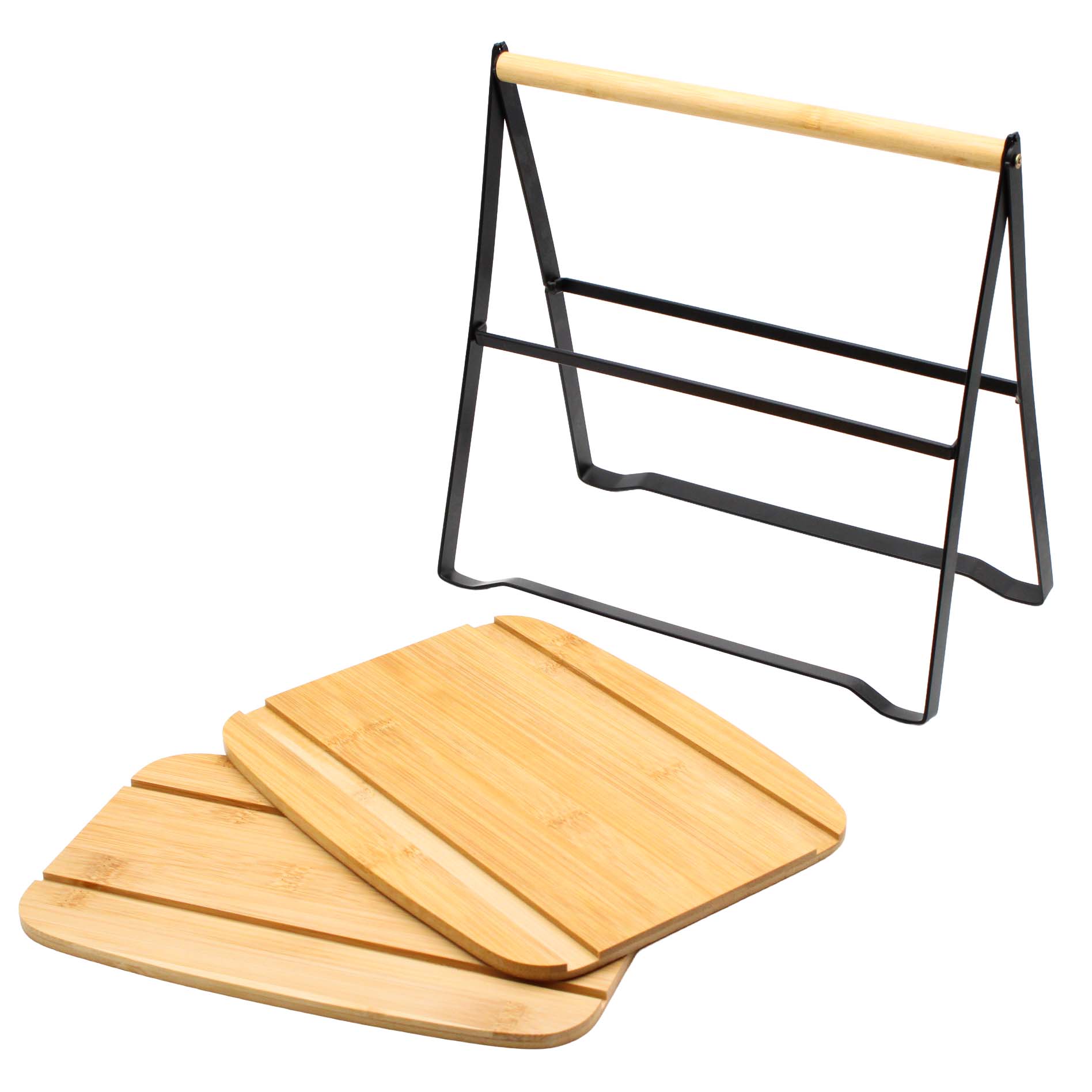 Konstrukcja łączy naturalne drewno bambusowe z solidnym, metalowym stelażem malowanym proszkowo, co zapewnia trwałość oraz nowoczesny wygląd. Dzięki składanej formie patera jest wygodna w przechowywaniu, a zdejmowane tace umożliwiają łatwe czyszczenie i elastyczne użytkowanie.