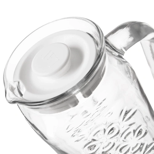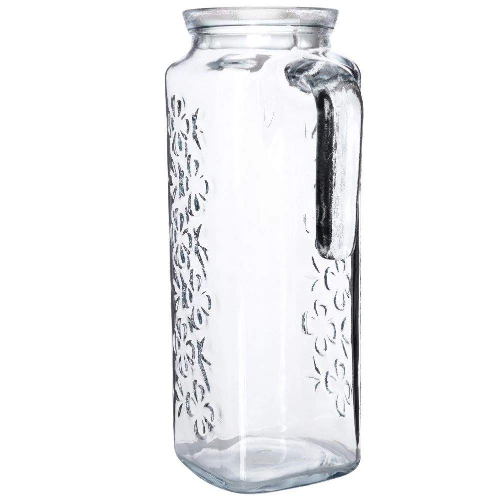 - SZKLANY - Dzbanek do napojów z pokrywką. Wykonany z grubego, przezroczystego szkła. Posiada efektowne zdobienia na powierzchni. Dzbanek ma pojemność 1,1 litra oraz wymiary: 13 x 8,5 x 23,5 cm. Maksymalna pojemność dzbanka bez pokrywki wynosi 1,2 litra.