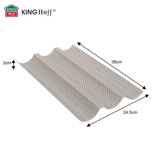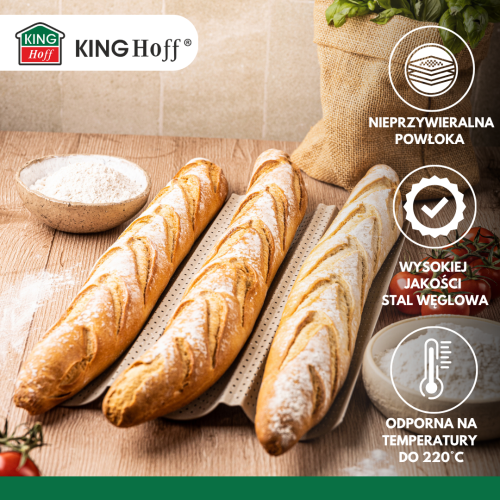 Forma do pieczenia bagietek marki KINGHoff to praktyczna perforowana blacha, dzięki której w prosty sposób przygotujesz trzy chrupiące bagietki jednocześnie. Specjalnie wyprofilowane rowki utrzymują kształt pieczywa podczas pieczenia, a setki drobnych otworów zapewniają doskonałą cyrkulację gorącego powietrza. Efekt – równomiernie wypieczone bagietki z idealnie chrupiącą skórką i miękkim, puszystym wnętrzem.