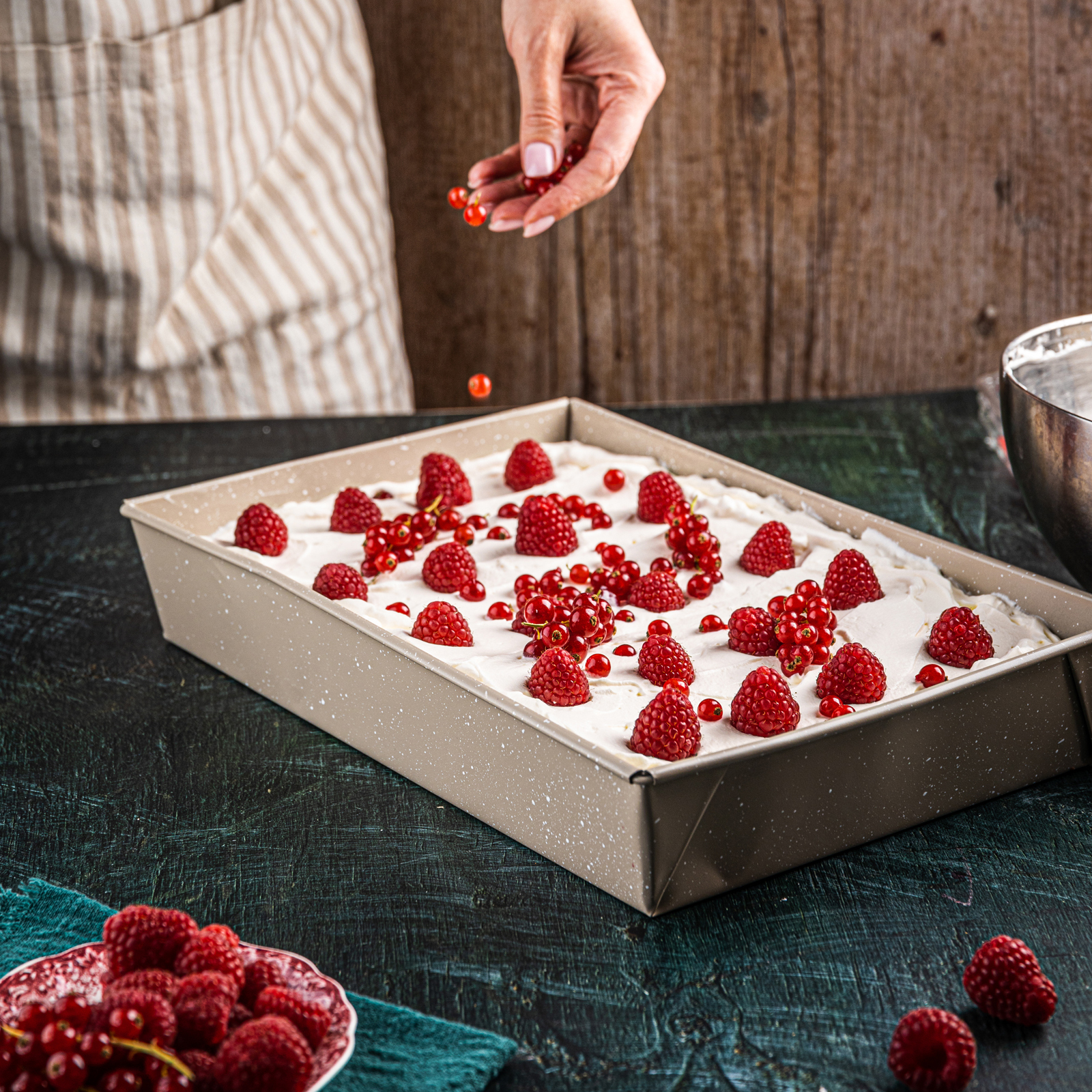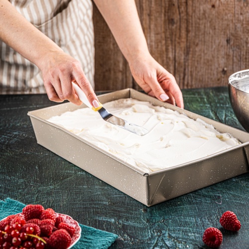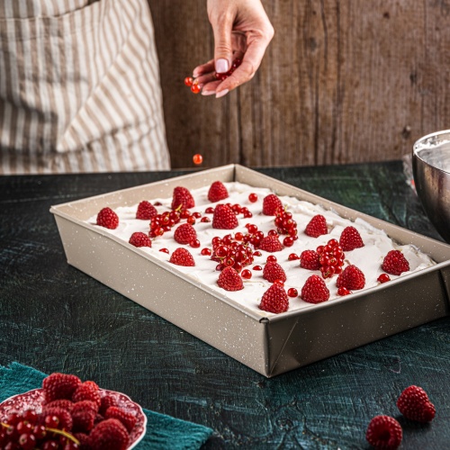 Dzięki wysokim ściankom (6 cm) i solidnym krawędziom forma zachowuje stabilność nawet przy cięższych masach, takich jak serniki, miodowniki czy karpatki. Tłoczone dno wspomaga cyrkulację powietrza, co zapobiega zakalcowi i zapewnia równomiernie wypieczony, chrupiący spód.