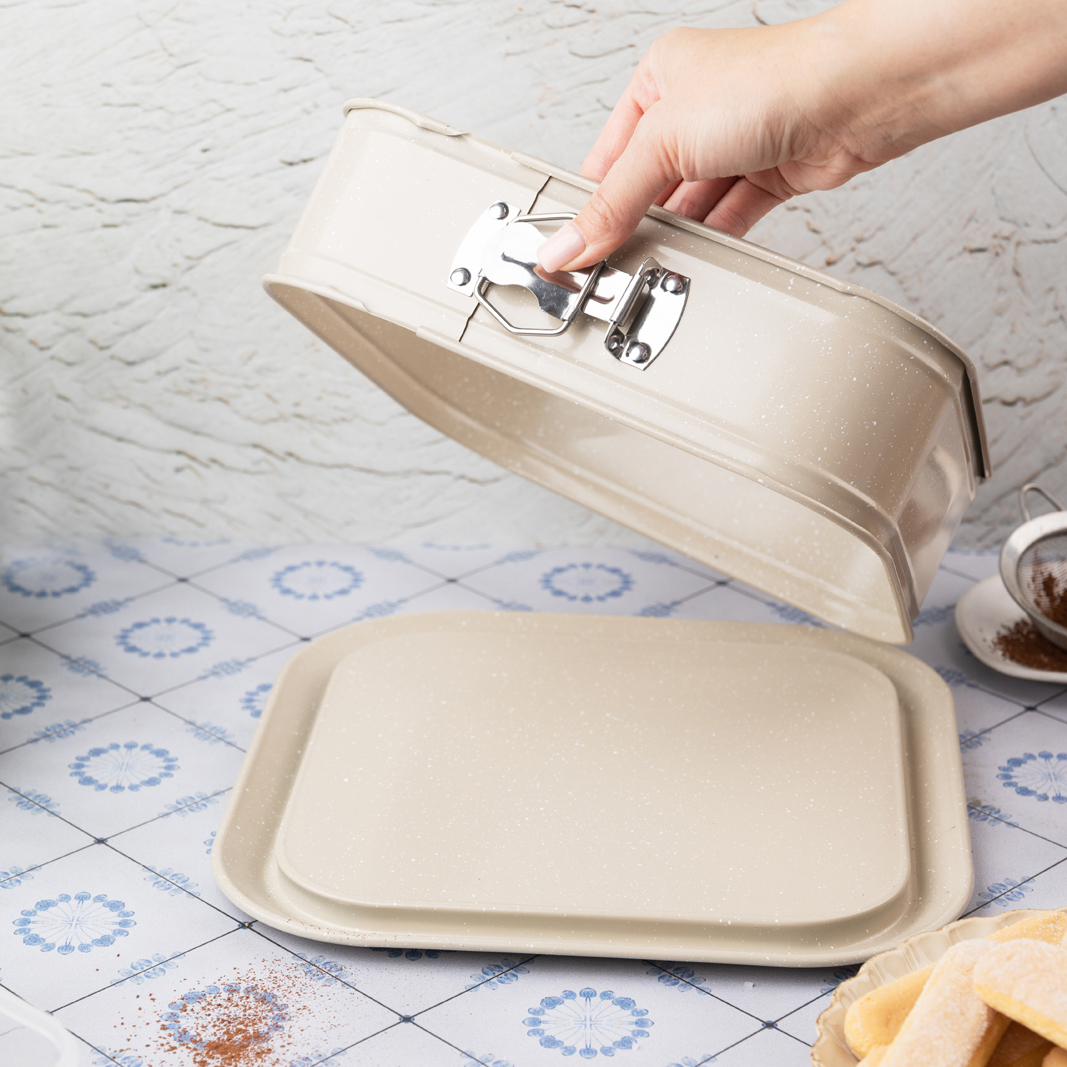 Nieprzywierająca powłoka sprawia, że ciasto łatwo odchodzi od formy, a stabilna taca dolna umożliwia bezpieczne przenoszenie wypieku i chroni piekarnik przed zabrudzeniami. Uniwersalny rozmiar 27,5 x 27,5 x 8 cm sprawia, że forma doskonale nadaje się zarówno do pieczenia, jak i deserów na zimno.