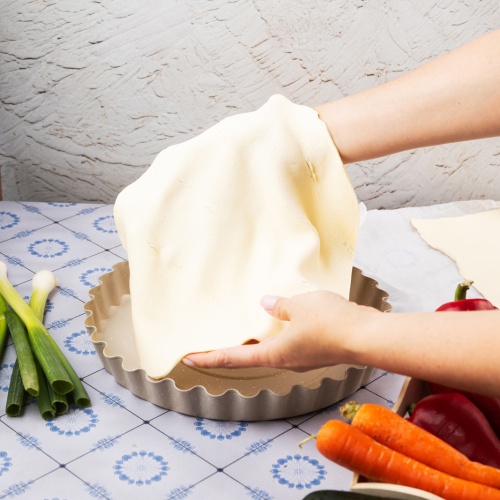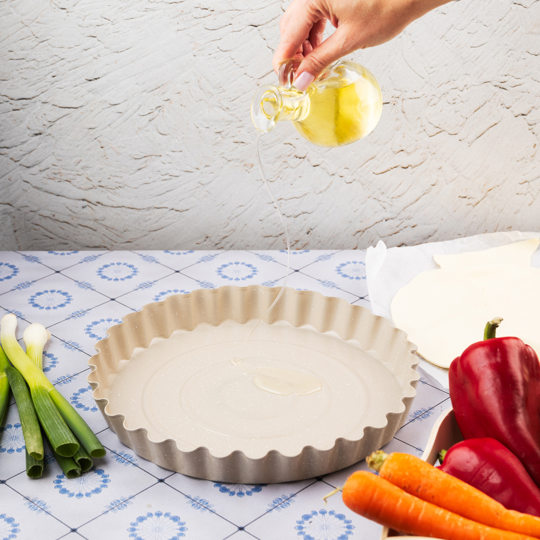Średnica 28 cm sprawia, że forma doskonale nadaje się do przygotowywania tart, quiche, kruchych spodów czy serników na zimno. Beżowe marmurkowe wykończenie nadaje jej estetyczny, nowoczesny wygląd, który świetnie komponuje się z każdą kuchnią.