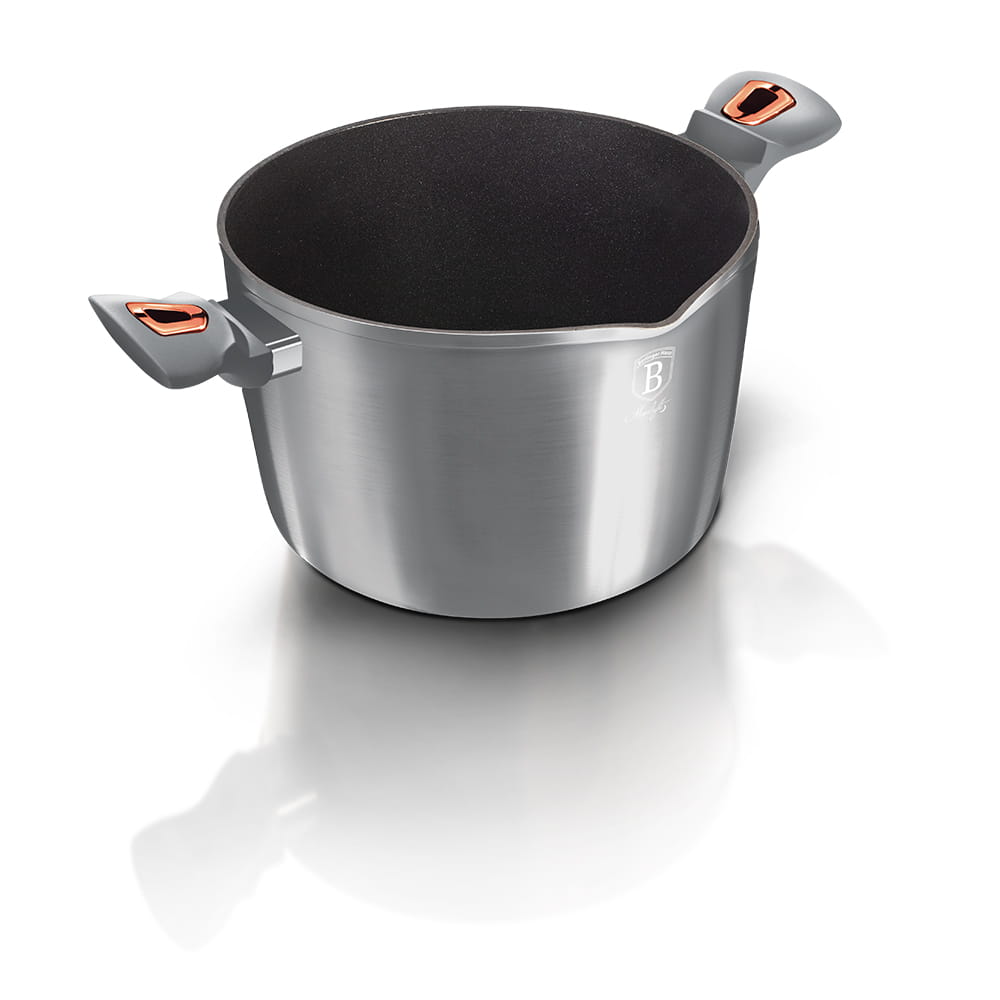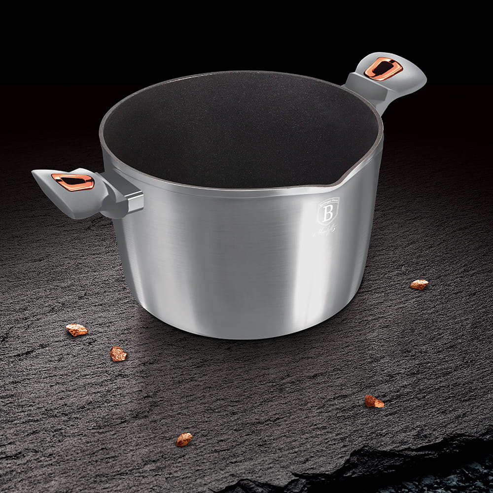 Garnki i akcesoria z serii METALLIC firmy BERLINGER HAUS wykonane są z wysokiej klasy kutego aluminium pokrytego wewnątrz potrójną powłoką tytanową o bardzo wysokim współczynniku twardości. Powłoka zewnętrzna występuje w kilku wersjach kolorystycznych o charakterystycznym metalicznym połysku. Te atrakcyjne i modne naczynia wyposażone są standardowo w uchwyty typu SOFT TOUCH (silikonowa rączka). Przystosowane do wszystkich rodzajów kuchenek: gazowa, elektryczna, ceramiczna, halogenowa, indukcyjna. System TURBO INDUCTION (bardzo szybko nagrzewają się) pozwala zaoszczędzić nawet 35% energii.