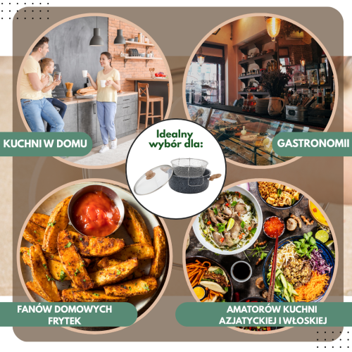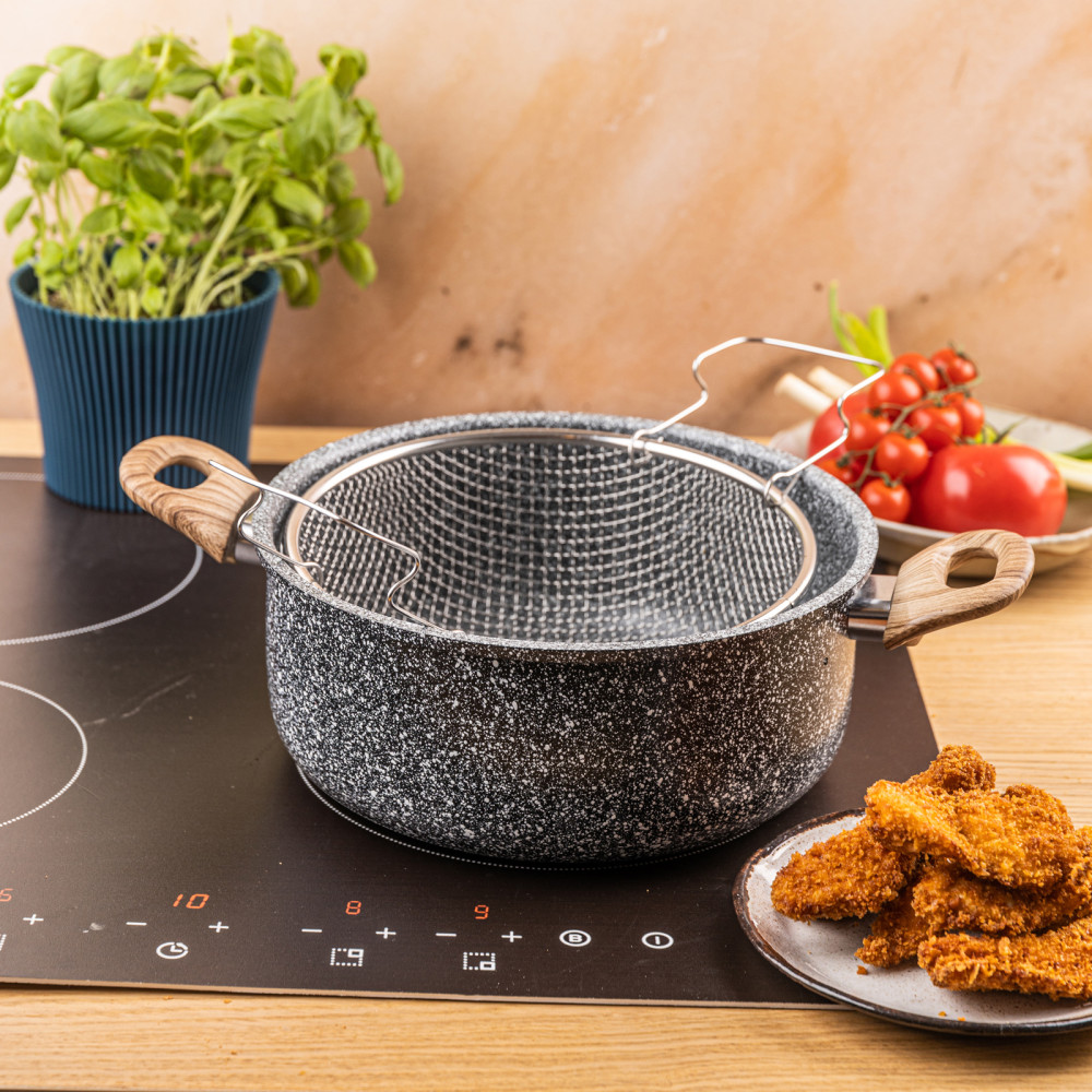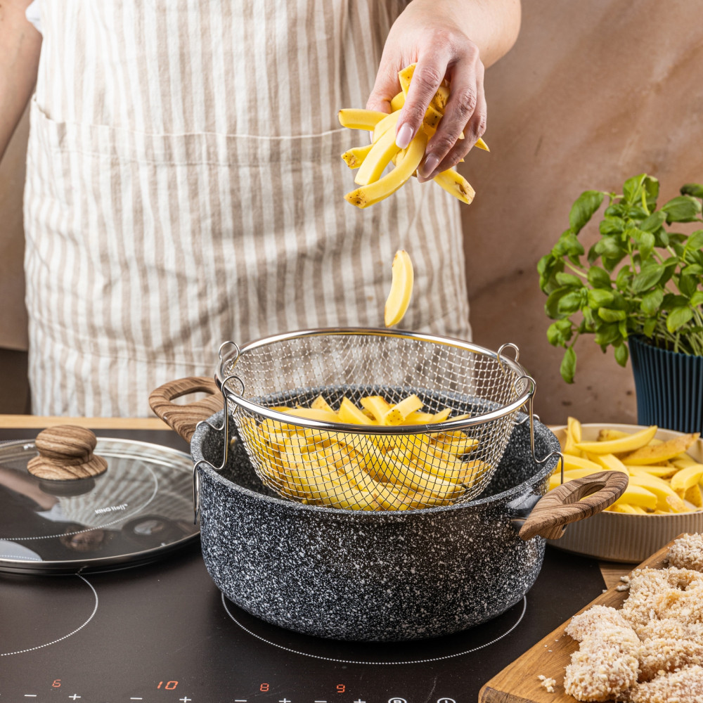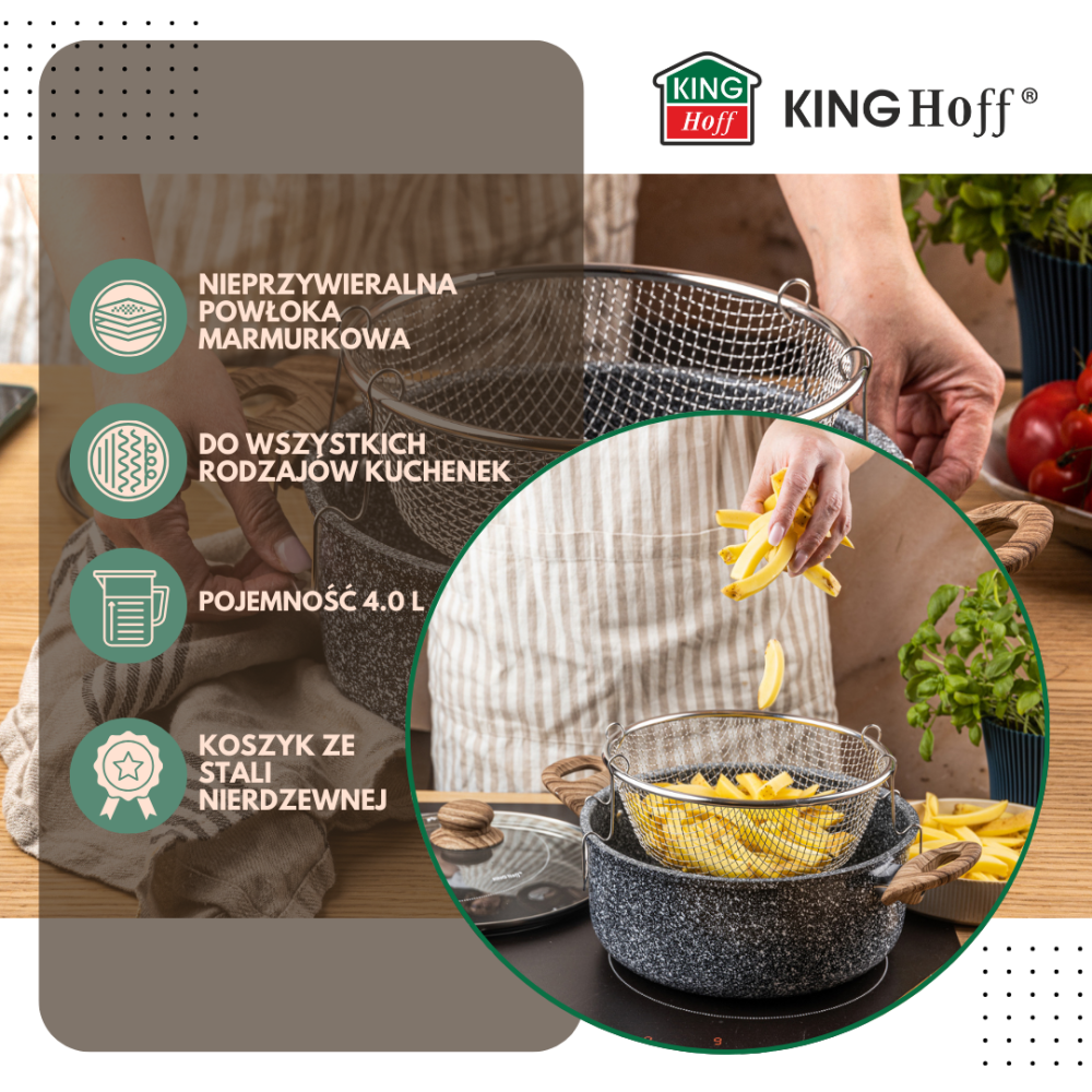 KingHoff KH-1985 to wszechstronny garnek o pojemności 4 litrów, który pozwala wygodnie smażyć, gotować, dusić i odsączać potrawy w jednym naczyniu. Dzięki koszykowi ze stali nierdzewnej, szklanej pokrywce z odpowietrznikiem oraz marmurkowej powłoce nieprzywierającej świetnie sprawdza się do frytek, tempury, mięs, makaronów czy dań azjatyckich. To praktyczne i eleganckie rozwiązanie zarówno do kuchni domowej, jak i gastronomii.
