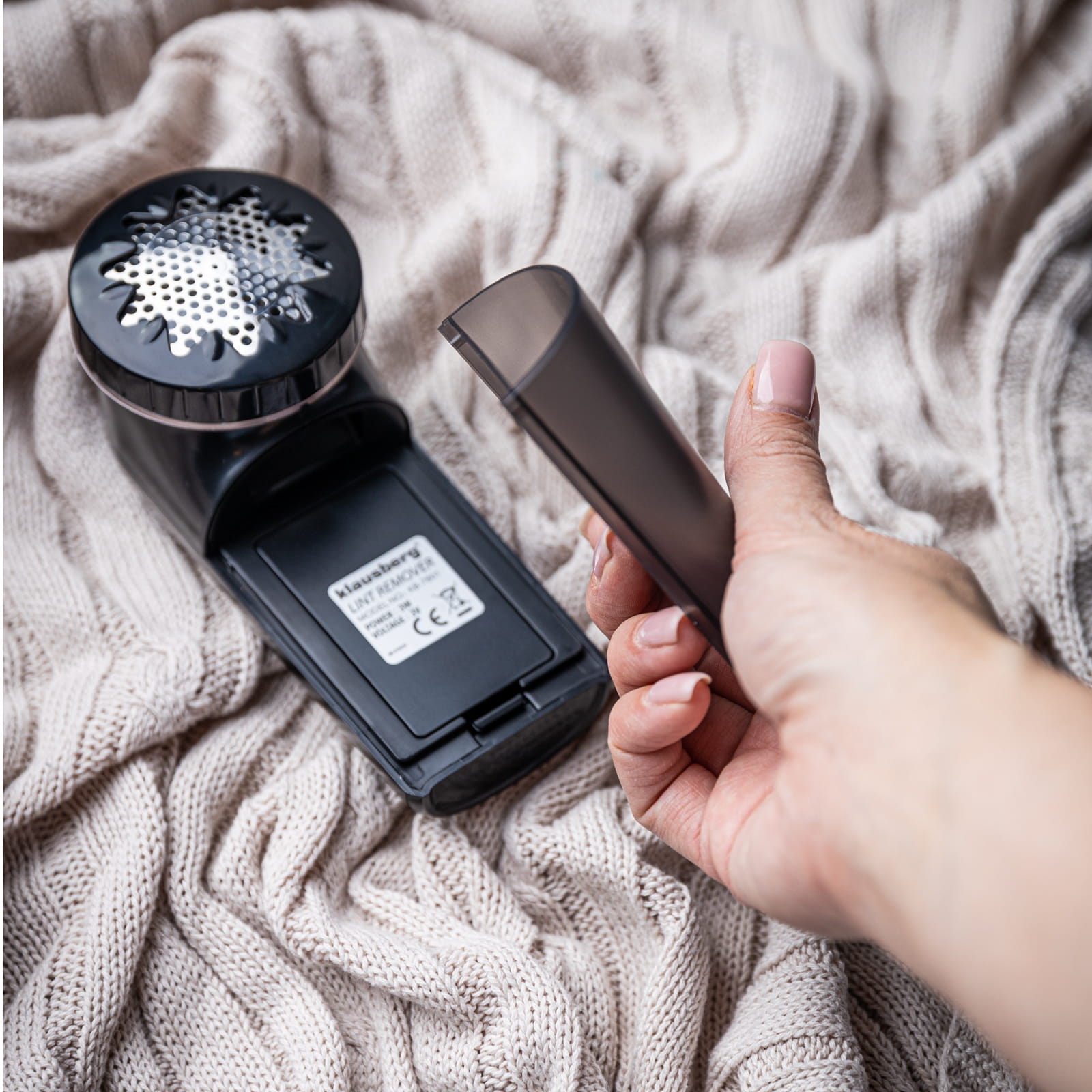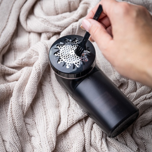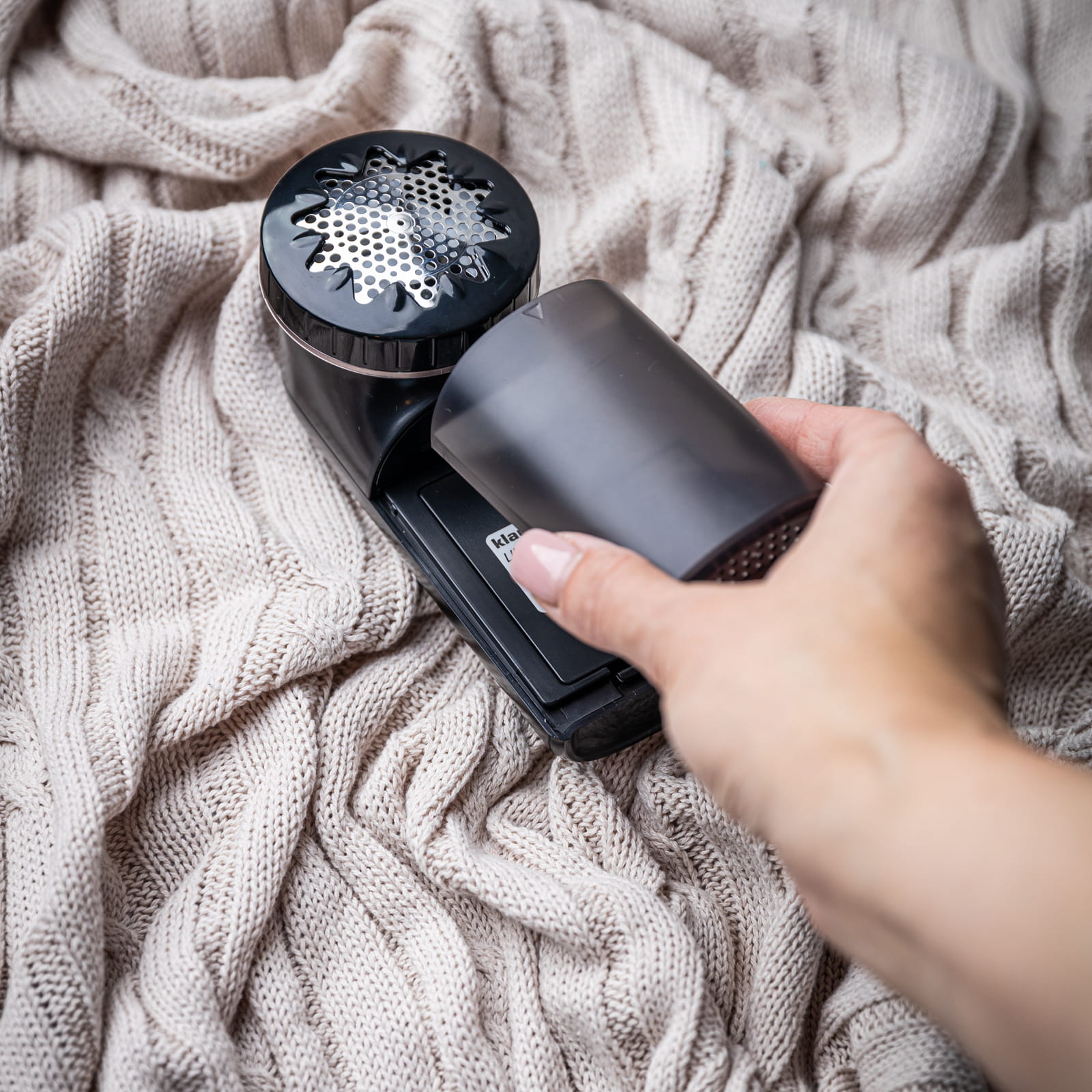 - Wbudowany pojemniczek na obcięte włókna – zmechacenia trafiają do specjalnego, łatwo demontowalnego pojemnika, który można szybko opróżnić, co sprawia, że czyszczenie urządzenia jest wyjątkowo proste.