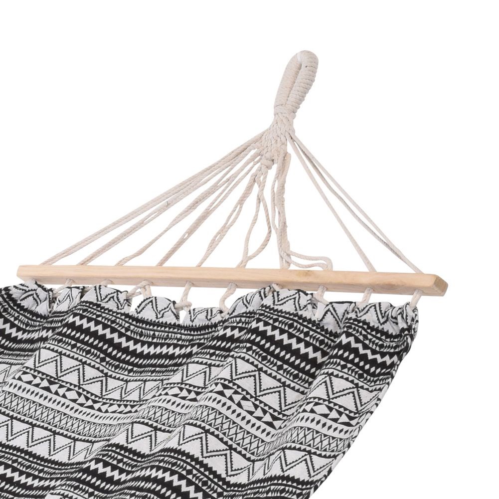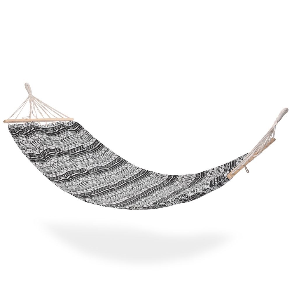 - KLASYCZNY WZÓR - Hamak utrzymany jest w modnej kolorystyce, która świetnie komponuje się z ogrodem. Hamak posiada ciekawy wzór w kolorze biało czarnym.