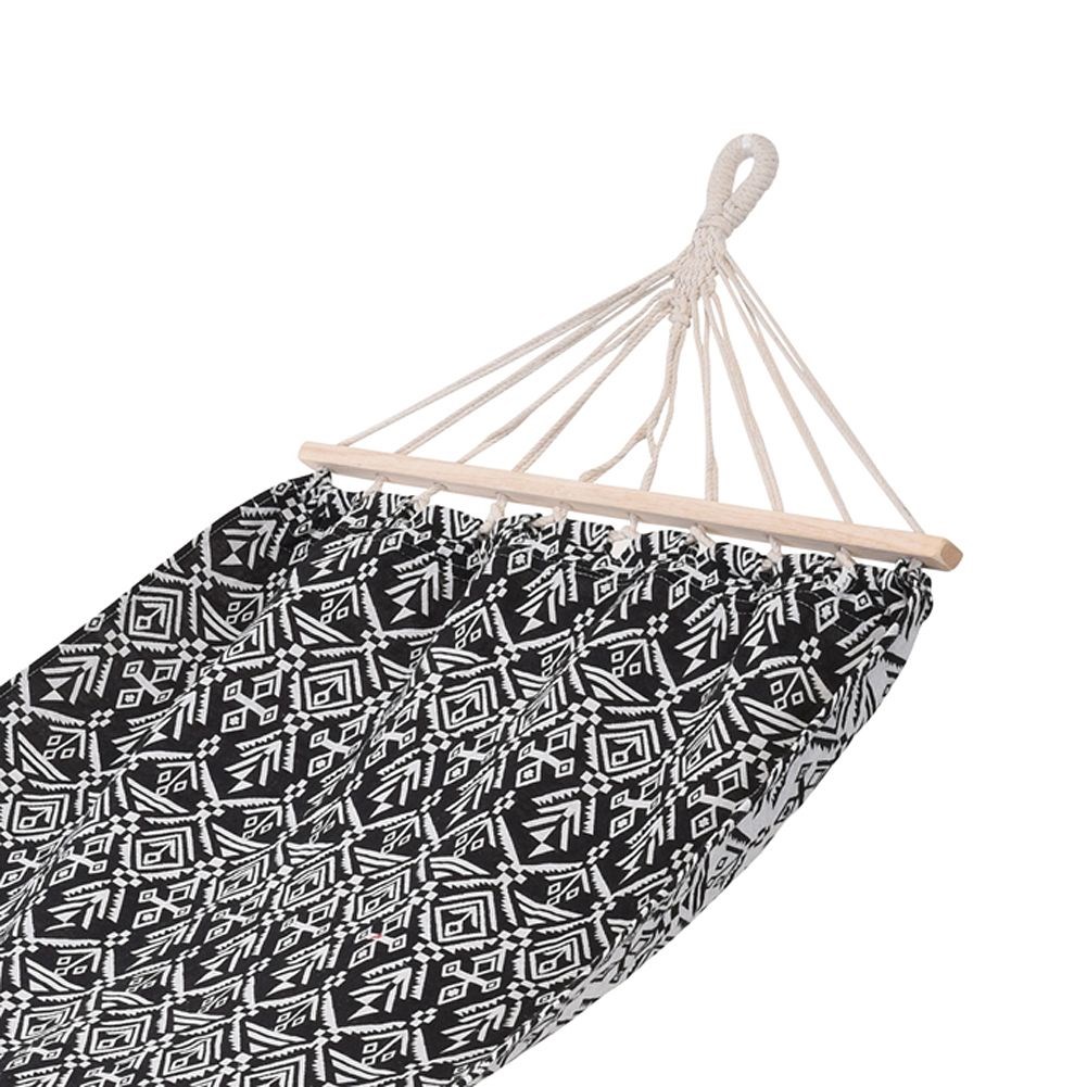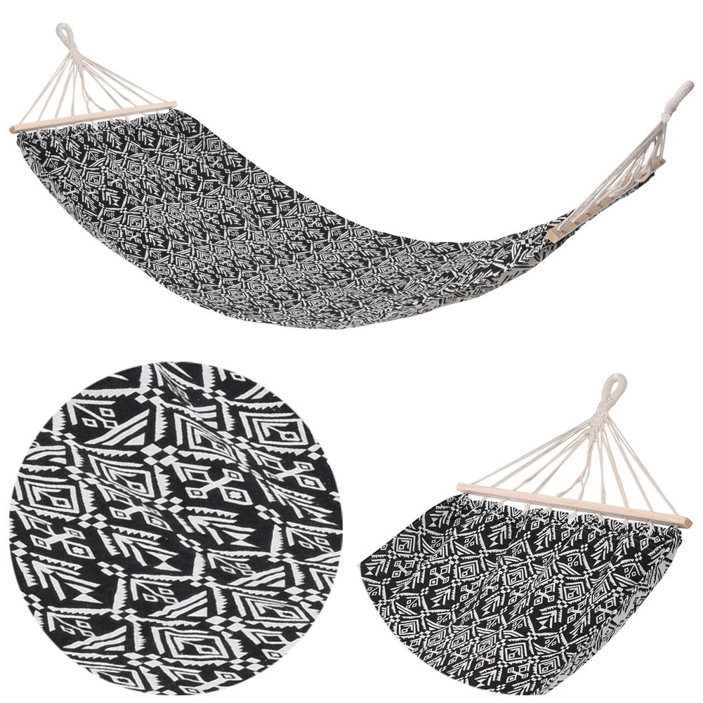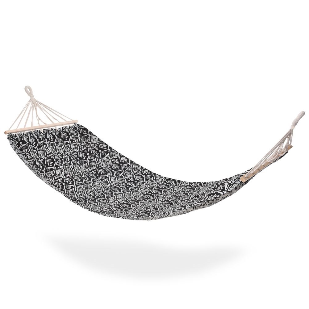 - KLASYCZNY WZÓR - Hamak utrzymany jest w modnej kolorystyce, która świetnie komponuje się z ogrodem. Hamak posiada ciekawy wzór w kolorze biało czarnym.