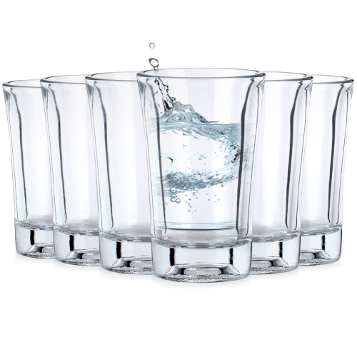 Zestaw sześciu kieliszków do wódki, nalewki lub shotów. Wykonane z grubego, przezroczystego szkła. Nadają się do mycia w zmywarce do naczyń.