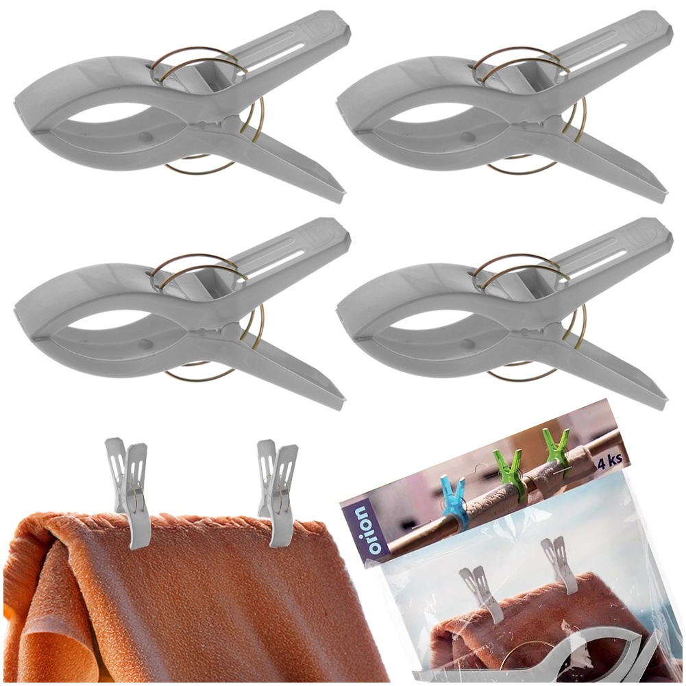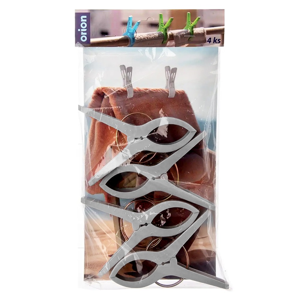 Komplet czterech klipsów do ręcznika plażowego. Dzięki nim wiatr nie zdmuchnie, ani nie podwinie ręcznika lub koca. Klipsy są bardzo proste w obsłudze. Idealny zestaw na plażę, ale również kemping czy pod namiot. Oryginalny produkt czeskiej marki Orion. Wyprodukowano zgodnie z europejskimi standardami.