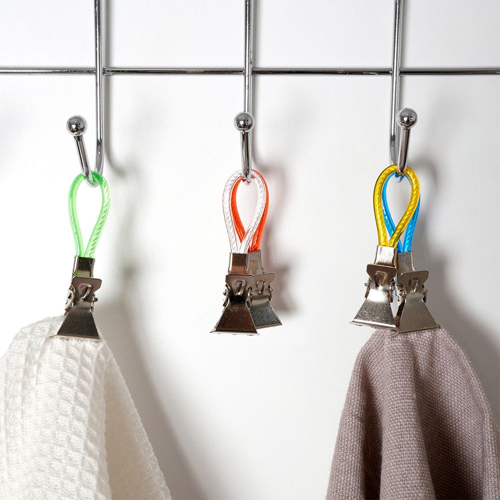 Zestaw praktycznych klipsów do powieszenia ręczników lub ścierek. Haczyki sprawdzą się zarówno w łazience jak i kuchni. Zestaw zawiera 5 sztuk wieszaków w różnych kolorach.