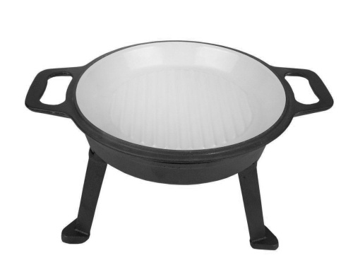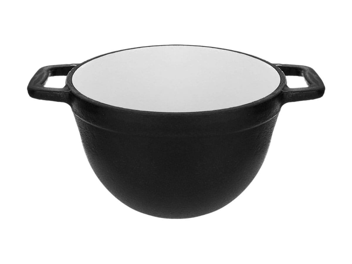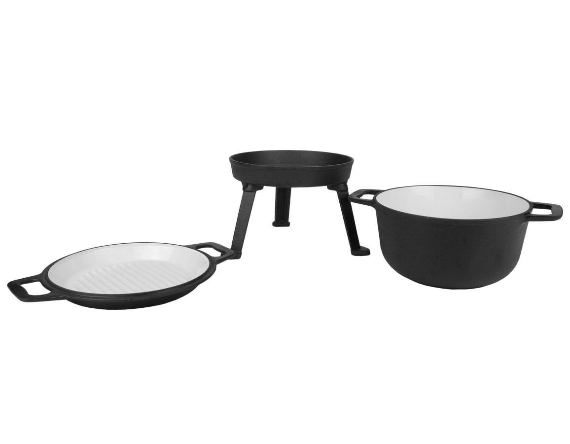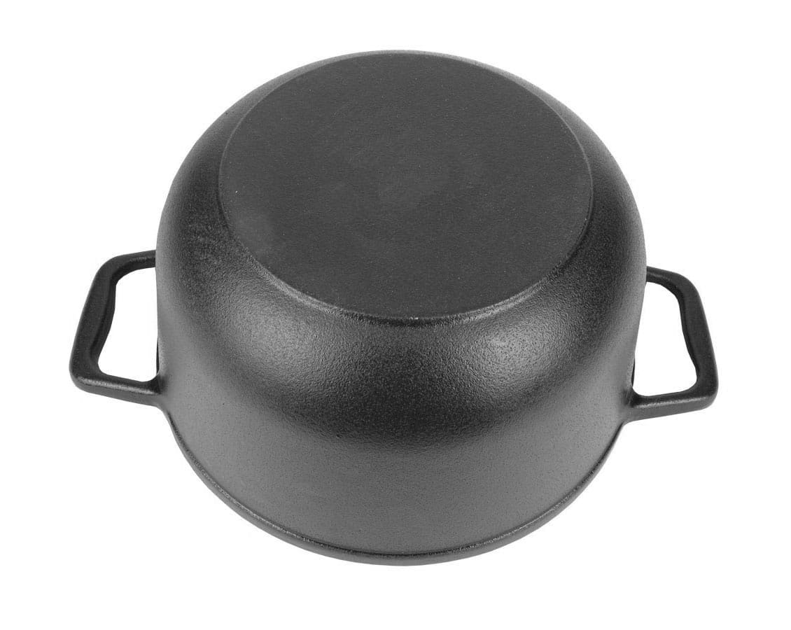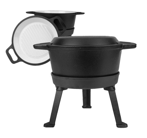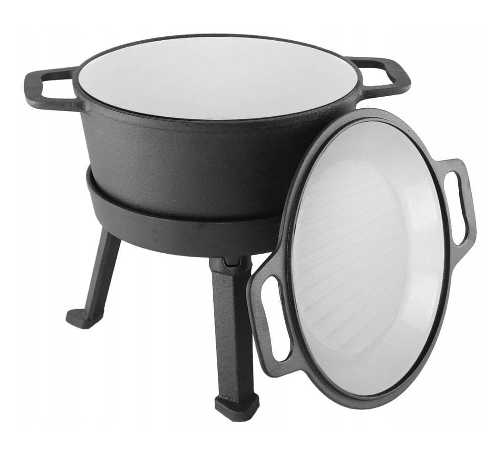 Kociołek żeliwny z patelnią grillową myśliwski o pojemności 5L z patelnią grillową wykonany z żeliwa szarego, oksydowany z zewnątrz oraz emaliowany wewnątrz.