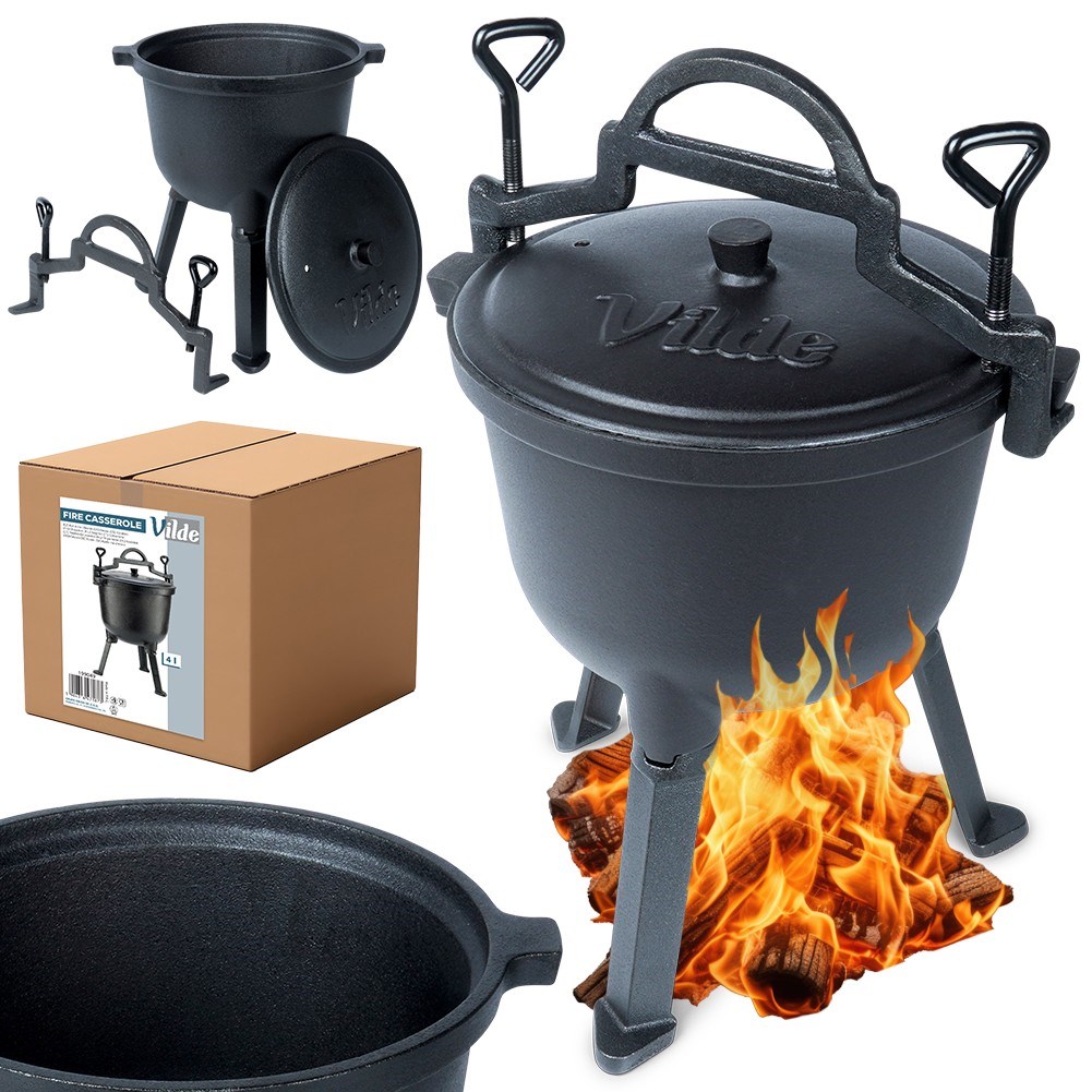 Okrągły kociołek żeliwny na nóżkach z pokrywką i uchwytem do zawieszenia. Idealny do gotowania, pieczenia, duszenia oraz smażenia potraw na ognisku, grillu lub nad otwartym ogniem. Potrawy przygotowane w kociołku będą soczyste i aromatyczne. Przydatny w trakcie różnego rodzaju spotkań, uroczystości czy imprez organizowanych na świeżym powietrzu. Oryginalny produkt marki Vilde z linii Cast Line. Wyprodukowano zgodnie z europejskimi standardami.
