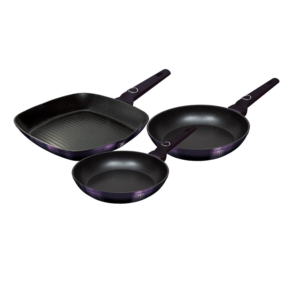 Zestaw 3 patelni z nieprzywierającą powłoką tytanową marki BERLINGER HAUS z serii PURPLE ECLIPSE