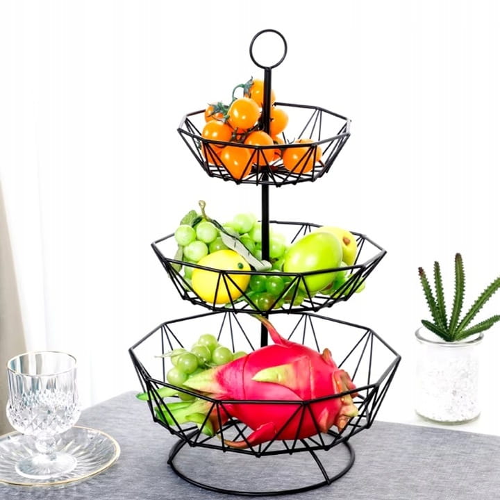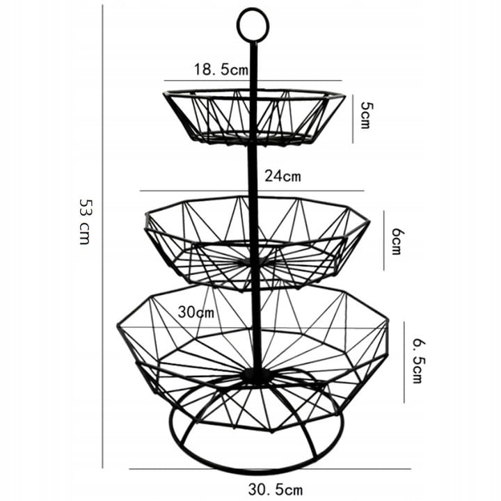 3-poziomowa patera na owoce wykonana ze stali lakierowanej proszkowo na kolor czarny mat. Kosz piętrowy na owoce wykonany z prętów stalowych malowanych proszkowo. Może posłużyć do przechowywania owoców lub warzyw. Koszyk doskonal prezentuje się zarówno na kuchennym blacie jak i na eleganckim stole.