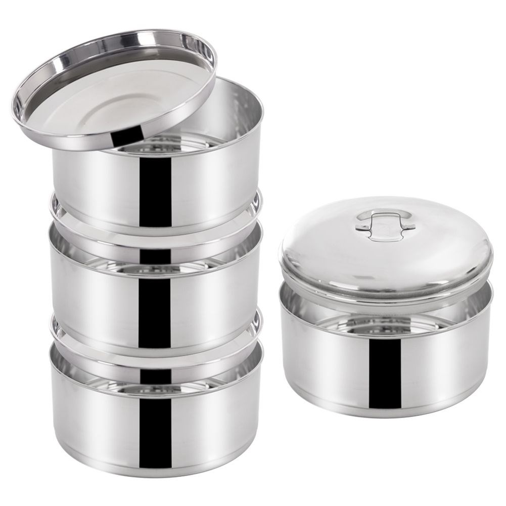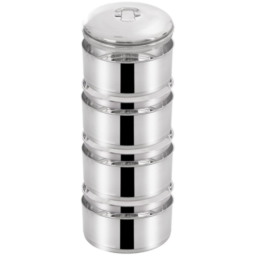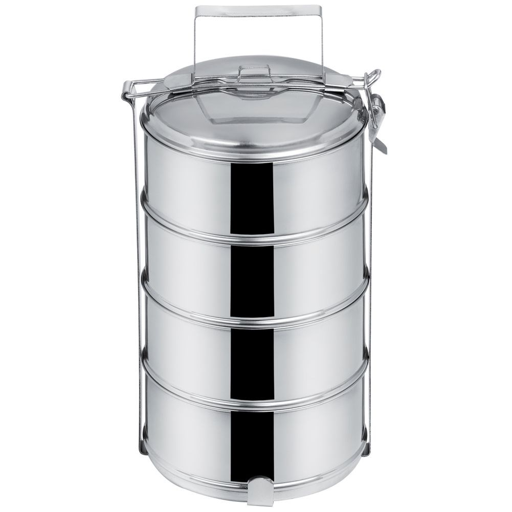 Menażka do przenoszenia żywności. W zestawie 4 pojemniki z pokrywkami oraz stelaż z uchwytem. Wykonana z najwyższej jakości stali nierdzewnej. Każdy pojemnik ma pojemność 1,3 l.