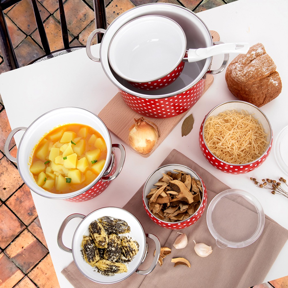 - Wykonana ze stali emaliowanej - Wykonana z najwyższej jakości stali emaliowanej w czerwonym kolorze. Posiada efektowane zdobienie w postaci białych grochów na powierzchni. Wnętrze miski jest w kolorze białym. Rant miski został wykonany ze stali nierdzewnej w srebrnym kolorze. Pokrywka wykonana z przezroczystego tworzywa. Emalia, którą pokryto naczynie jest materiałem przyjaznym dla zdrowia, a nawet bezpiecznym dla alergików.
