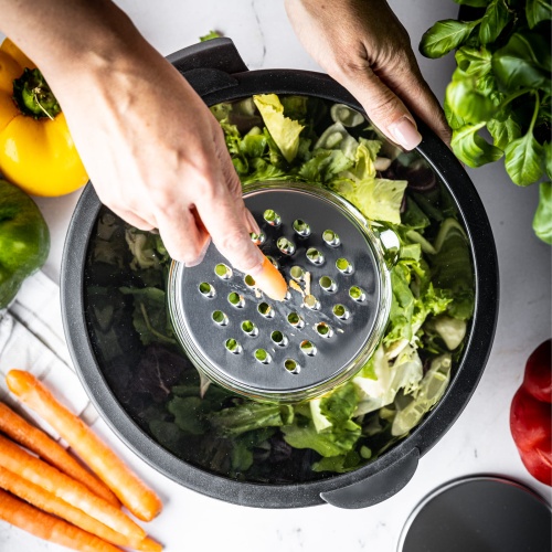 - Możliwość ścierania warzyw, owoców, czekolady i wielu innych produktów spożywczych bezpośrednio do miski. Hermetyczna pokrywka umożliwia przykrycie i przechowywania np. ciasta, startych warzyw w lodówce lub zamrażarce.