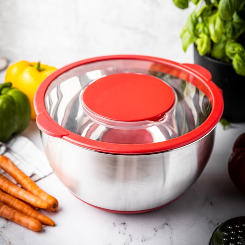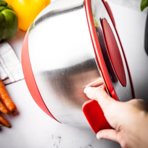 - Spód miski pokryty jest silikonową powłoką, dzięki czemu zwiększa stabilność i znacznie ogranicza ślizganie się miski podczas prac kuchennych.