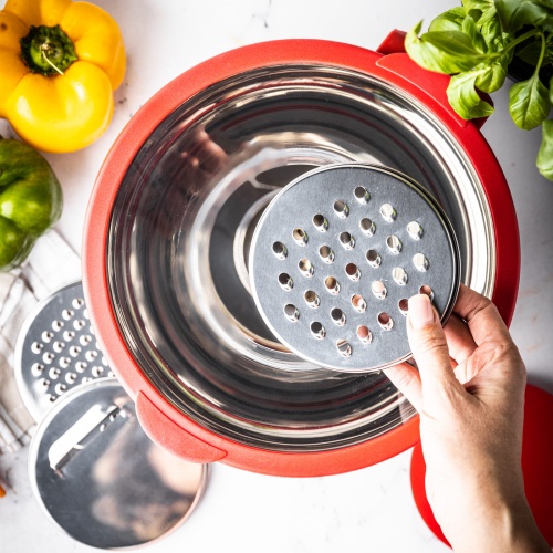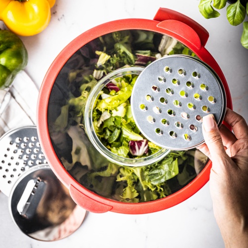 - Możliwość ścierania warzyw, owoców, czekolady i wielu innych produktów spożywczych bezpośrednio do miski. Hermetyczna pokrywka umożliwia przykrycie i przechowywania np. ciasta, startych warzyw w lodówce lub zamrażarce.