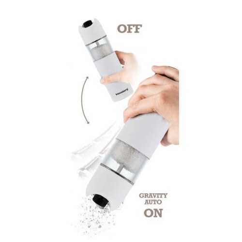 Bardzo ładny grawitacyjny młynek elektryczny do soli lub pieprzu. Łatwy w użyciu! Wystarczy przekręcić młynek do góry nogami i automatycznie zacznie pracę, odchylić i przestanie mielić. Wykonany z tworzywa sztucznego w matowym kolorze białym, pokryty cienką wartstwą silikonową. Obudowa z okienkiem wskazującym poziom zawartości ziaren. Wydajny silnik który bez trudu radzi siebie z każdym rodzajem pieprzu lub soli. Odporny na korozję ceramiczny mechanizm do ścierania z regulacją grubości mielenia. Elegancki kształt sprawia, że młynek efektownie prezentuje się w każdej kuchni.