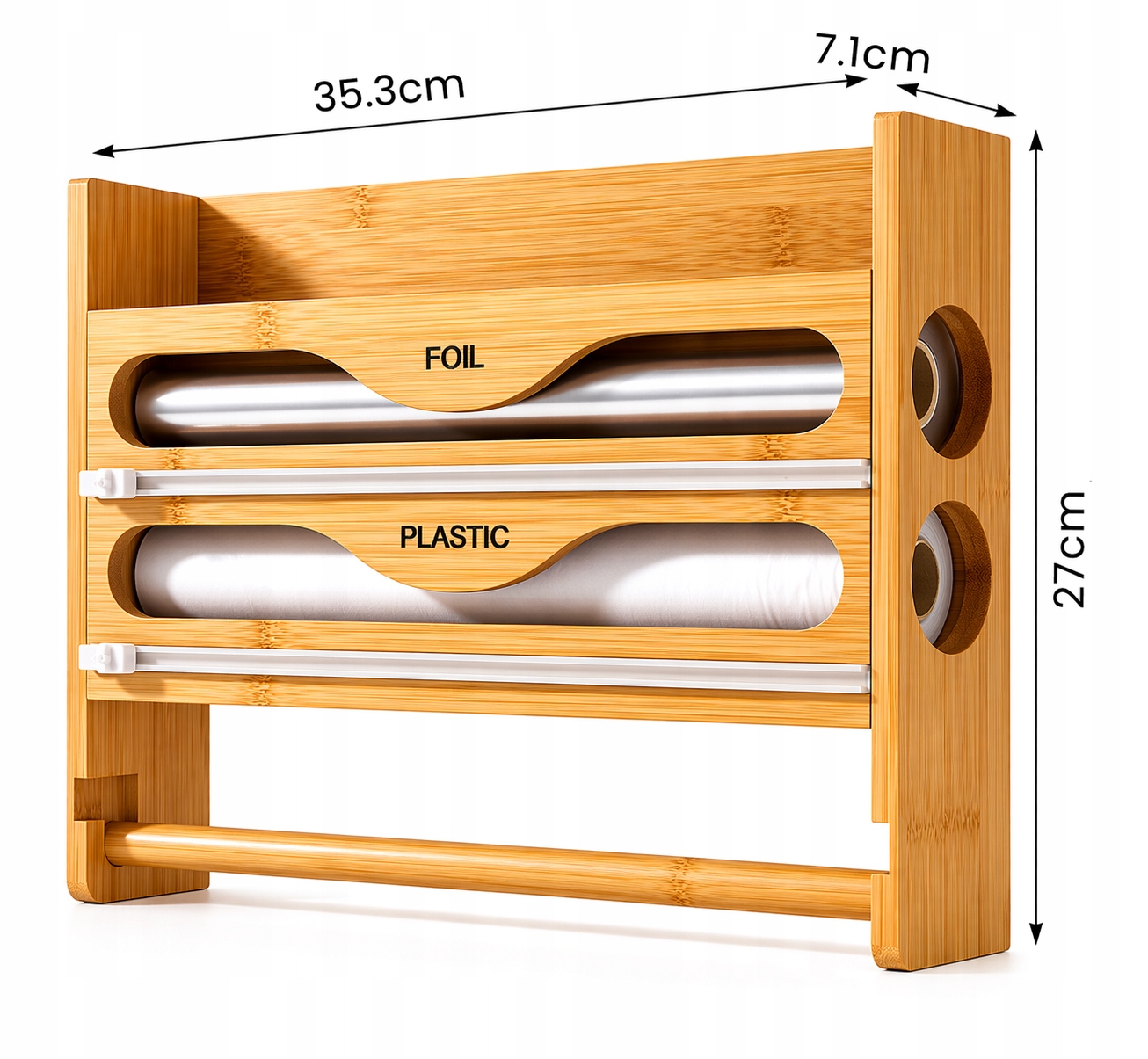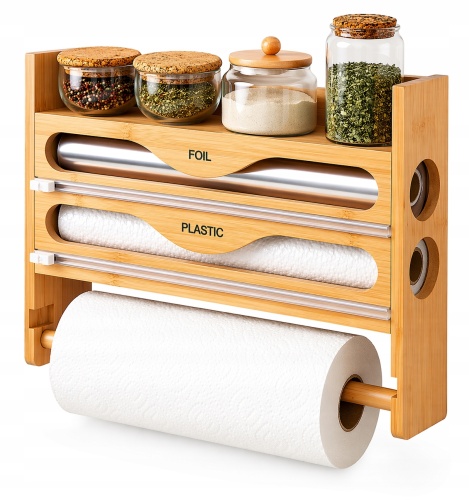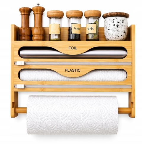 ORGANIZER KUCHENNY 4W1 BAMBUSOWY - Uchwyt na ręcznik, folie i przyprawy. Praktyczne rozwiązanie, które pomaga utrzymać porządek i oszczędza miejsce w kuchni. Wszystko, czego potrzebujesz, masz zawsze pod ręką.