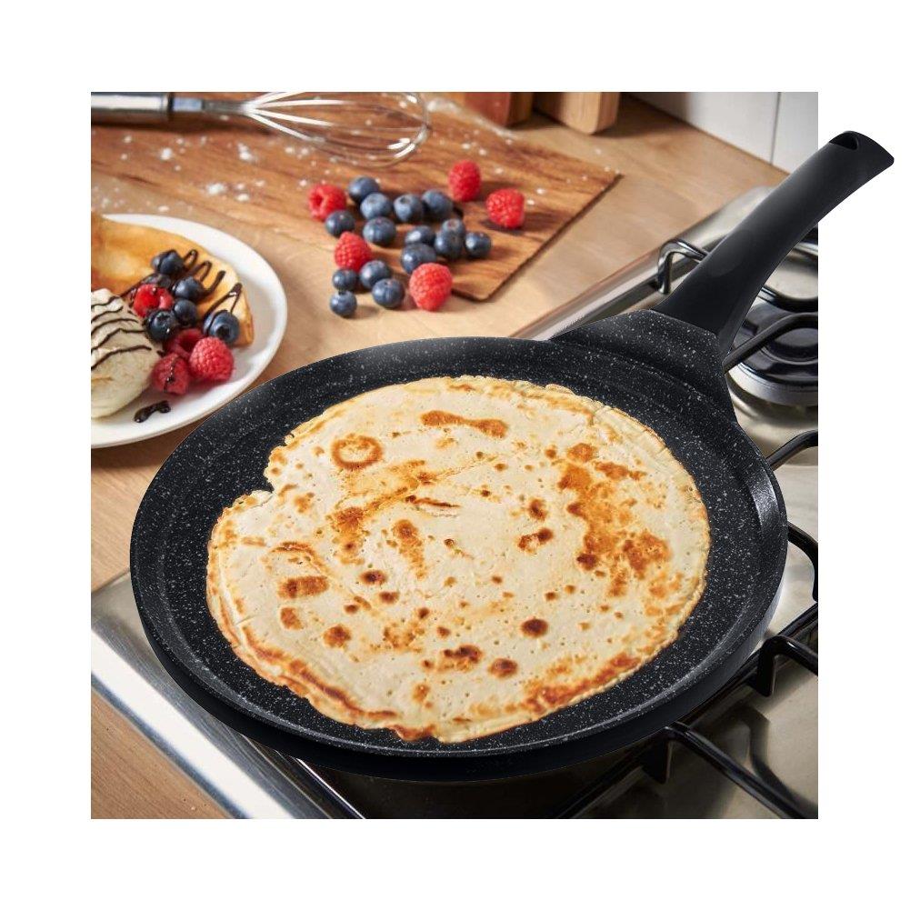 Ergonomiczna konstrukcja patelni sprawia, że ciepło rozprowadza się równomiernie i naleśniki się nie przypalają. Dodatkowo patelnia nagrzewa się bardzo szybko.