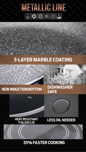 Garnki i akcesoria z serii METALLIC firmy BERLINGER HAUS wykonane są z wysokiej klasy kutego aluminium pokrytego wewnątrz potrójną powłoką granitową (marble) o bardzo wysokim współczynniku twardości. Powłoka zewnętrzna występuje w kilku wersjach kolorystycznych o charakterystycznym metalicznym połysku. Te atrakcyjne i modne naczynia wyposażone są standardowo w uchwyty typu SOFT TOUCH (silikon handle). Przystosowane do wszystkich rodzajów kuchenek: gazowa, elektryczna, ceramiczna, halogenowa, indukcyjna. System TURBO INDUCTION (bardzo szybko nagrzewają się) pozwala zaoszczędzić nawet 35% energii.