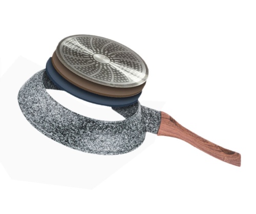 Dno ferromagnetyczne. Kompozycja aluminiowego korpusu i ferromagnetycznego dna umożliwia użytkowanie na kuchni indukcyjnej oraz na wszystkich innych rodzajach kuchni i wykorzystywania najlepszych właściwości akutermicznych odlewanego i kutego aluminium na wszystkich kuchenkach i płytach grzewczych. Możliwość gotowania/smażenia w temperaturze do 220°C