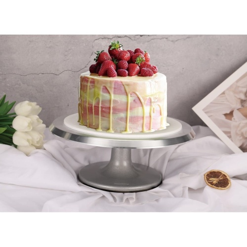 Nasz obrotowy stojak na ciasto umożliwia łatwy dostęp do wszystkich krawędzi ciasta, ułatwiając posmarowanie lukrem i serwowanie. Obraca się o 360°, zgodnie z ruchem wskazówek zegara lub przeciwnie do niego, co sprawia, że praca jest jeszcze bardziej wygodna. Posiada antypoślizgową podstawę o średnicy 18 cm oraz gumowe nóżki, które zapewniają stabilność podczas użytkowania.