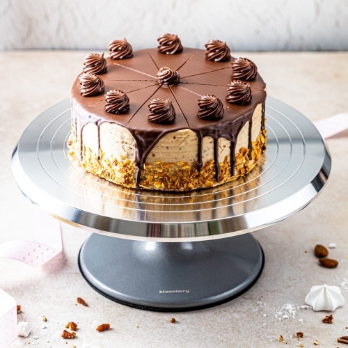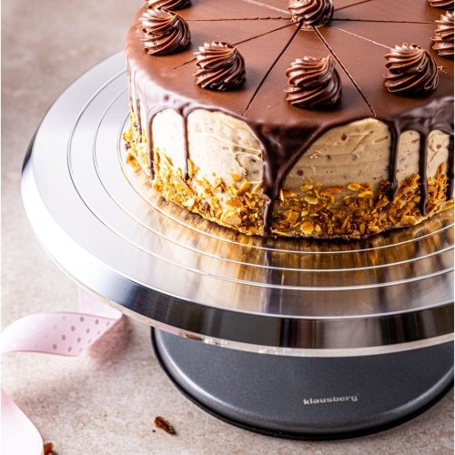 Odkryj doskonałe rozwiązanie do przygotowywania i podawania ciast dzięki Paterze Obrotowej firmy KLAUSBERG. Wykonana z wytrzymałego stopu aluminium, zapewnia doskonałą stabilność na blatach, eliminując przesuwanie się patery podczas pracy.