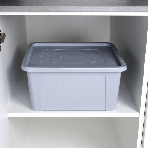 Pojemnik z pokrywą, przeznaczony do przechowywania różnych przedmiotów. Pomoże w utrzymaniu porządku. Wykonany z wytrzymałego tworzywa w szarym kolorze.