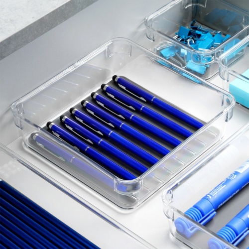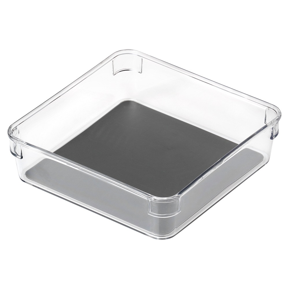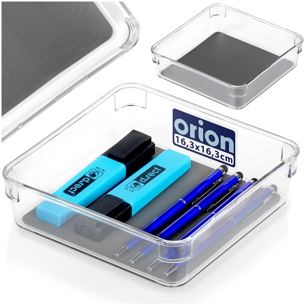 Pojemnik do przechowywania różnych przedmiotów w szufladzie lub szafce. Wykonany z przezroczystego tworzywa. Posiada antypoślizgowe nóżki oraz gumową matę wewnątrz.