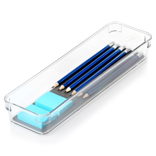Pojemnik do przechowywania różnych przedmiotów w szufladzie lub szafce. Wykonany z przezroczystego tworzywa. Posiada antypoślizgowe nóżki oraz gumową matę wewnątrz.