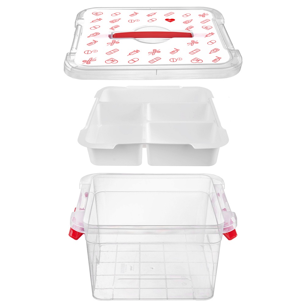 - Medyczny nadruk na pokrywie - Pojemnik wykonany z tworzywa w przezroczystym kolorze. Wyjmowany organizer w kolorze białym. Uchwyt oraz zamknięcie w kolorze czerwonym a pokrywka ozdobiona jest nadrukiem w formie czerwonych ikon o tematyce medycznej. Wzór zawiera m.in. rysunki tabletek, termometrów, strzykawek, buteleczek z lekami i plastrów, co nie tylko nadaje mu estetyczny wygląd, ale też jasno wskazuje jego przeznaczenie - przechowywanie artykułów związanych z domową apteczką.