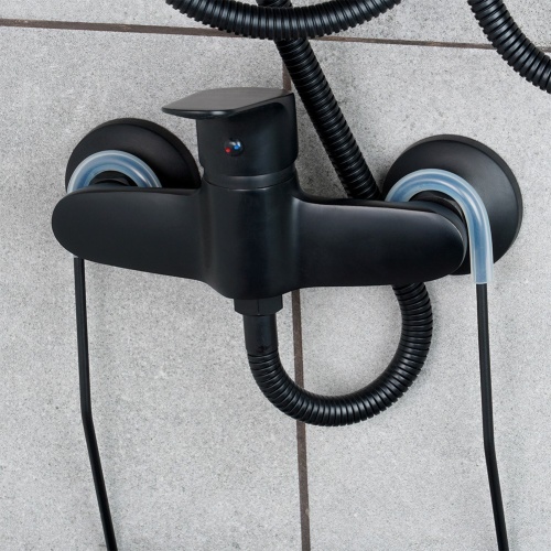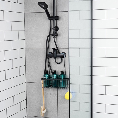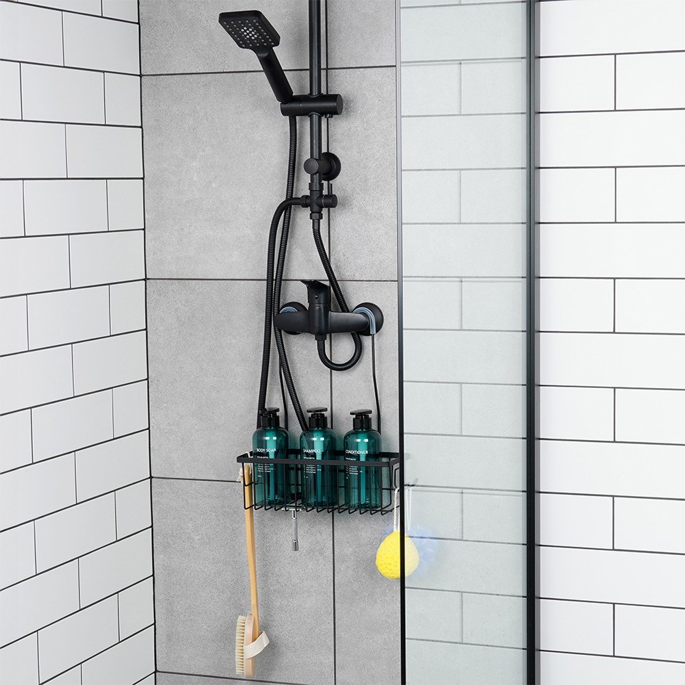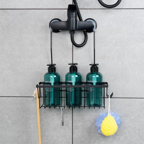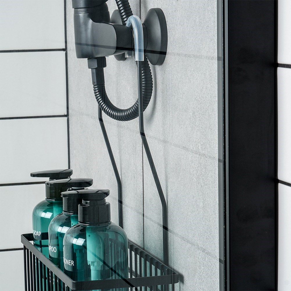 Półka łazienkowa na kosmetyki i akcesoria łazienkowe zawieszana na kranie baterii prysznicowej. Wykonana w całości z metalu, w modnym czarnym kolorze.