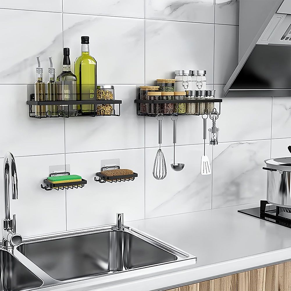 - UNIWERSALNE - Na półkach można przechowywać różne produkty i akcesoria do pielęgnacji, takie jak żel pod prysznic, szampon, kosmetyki, gąbki czy szczotki. Dodatkowo, półki posiadają wieszaki, na których możemy zawiesić gąbkę, szczotkę lub inne akcesoria. Duże półki wyposażone są w trzy wieszaki, a małe w dwa. Półki można również wykorzystać w kuchni jako półki na przyprawy.