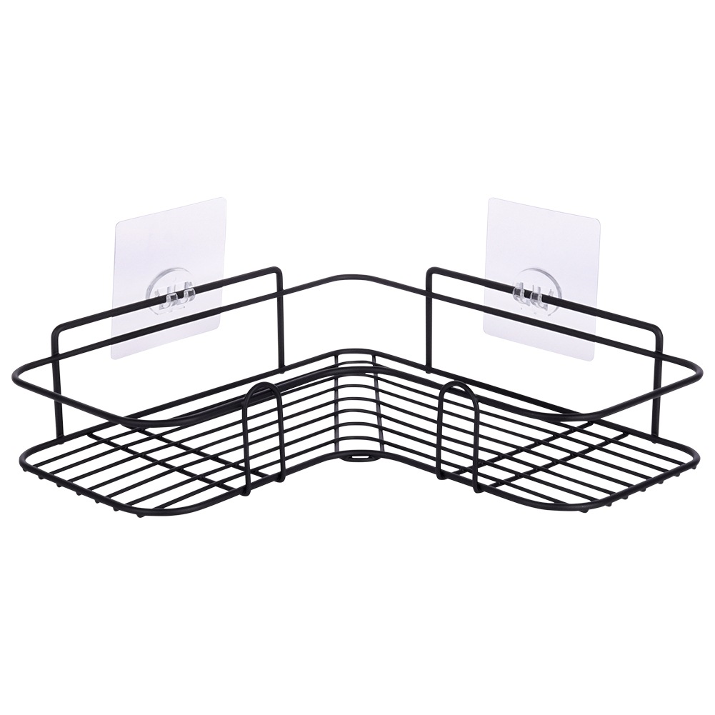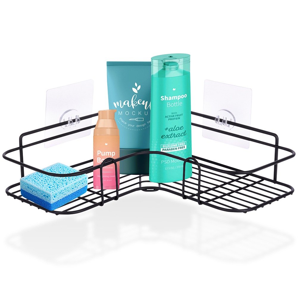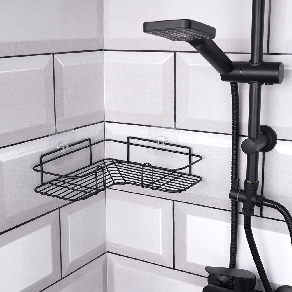 Narożna półka łazienkowa przyklejana za pomocą mocnej taśmy. Wykonana z metalu w czarnym kolorze. Idealna do montażu pod prysznicem tak, aby kosmetyki były zawsze pod ręką.