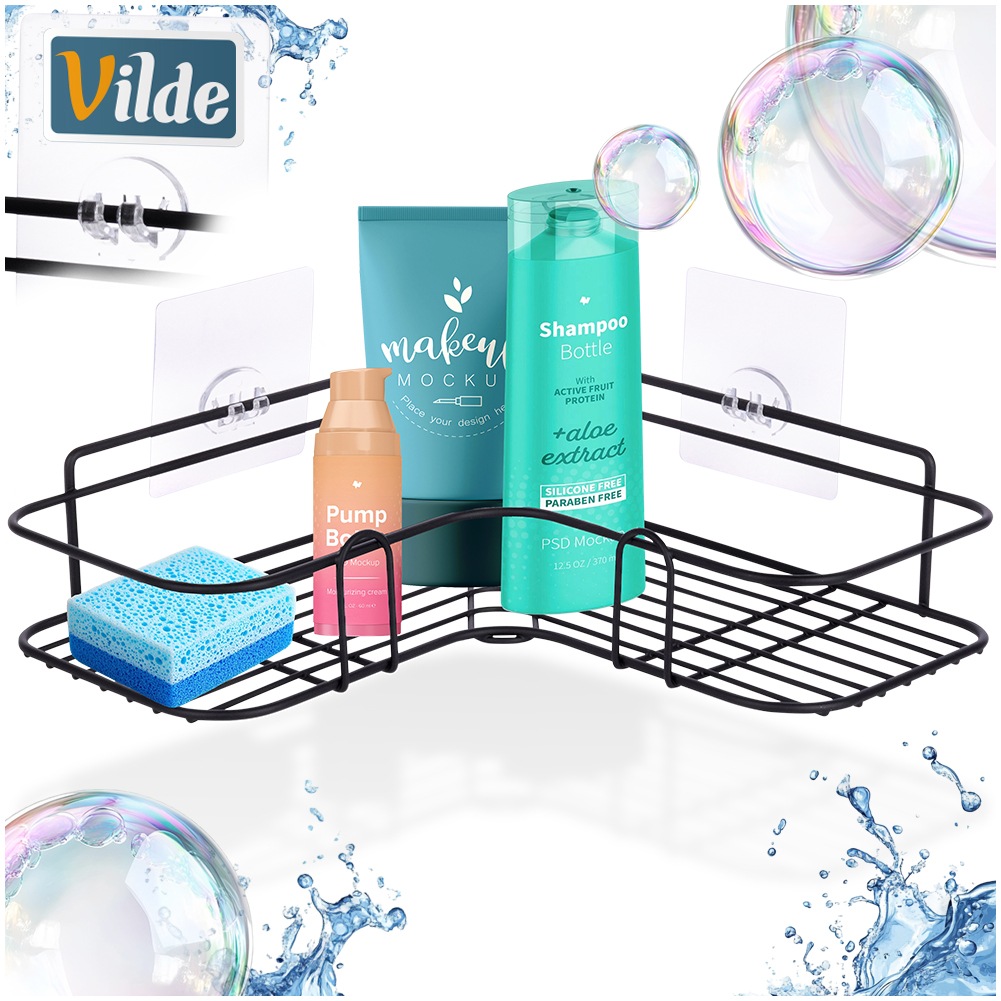Przyklejana, narożna półka pod prysznic na kosmetyki i akcesoria łazienkowe. Wykonana z wytrzymałych materiałów. Utrzymana w industrialnym stylu typu loft. Doskonale pasuje do każdego wnętrza łazienki, ale sprawdzi się również w kuchni. Łatwy montaż i praktyczne przechowywanie kosmetyków sprawią, że będzie ona bardzo praktycznym elementem wyposażenia łazienki. UWAGA! Powierzchnia, do której klejona będzie półka, powinna być prosta i odtłuszczona. W pierwszej kolejności należy przykleić maty samoprzylepne, a po upływie co najmniej 12 godzin można zamontować na nich półkę. Oryginalny produkt marki Vilde. Wyprodukowano zgodnie z europejskimi standardami.