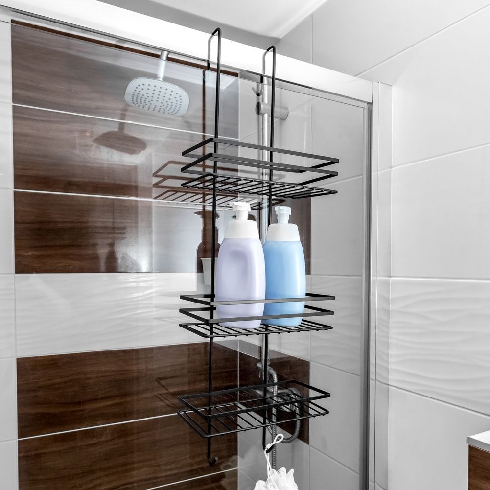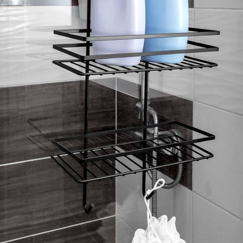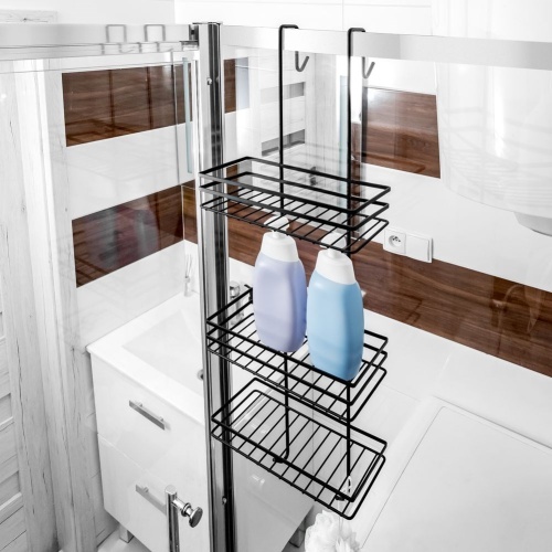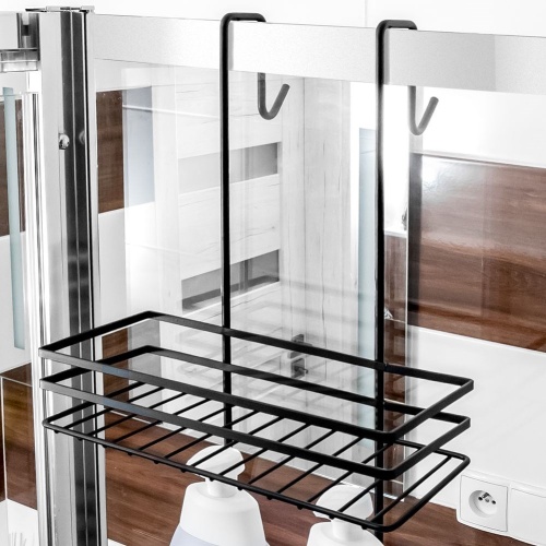 Półka łazienkowa na kosmetyki i akcesoria łazienkowe zawieszana na szybie kabiny prysznicowej. Wykonana w całości z metalu w modnym, czarnym kolorze.